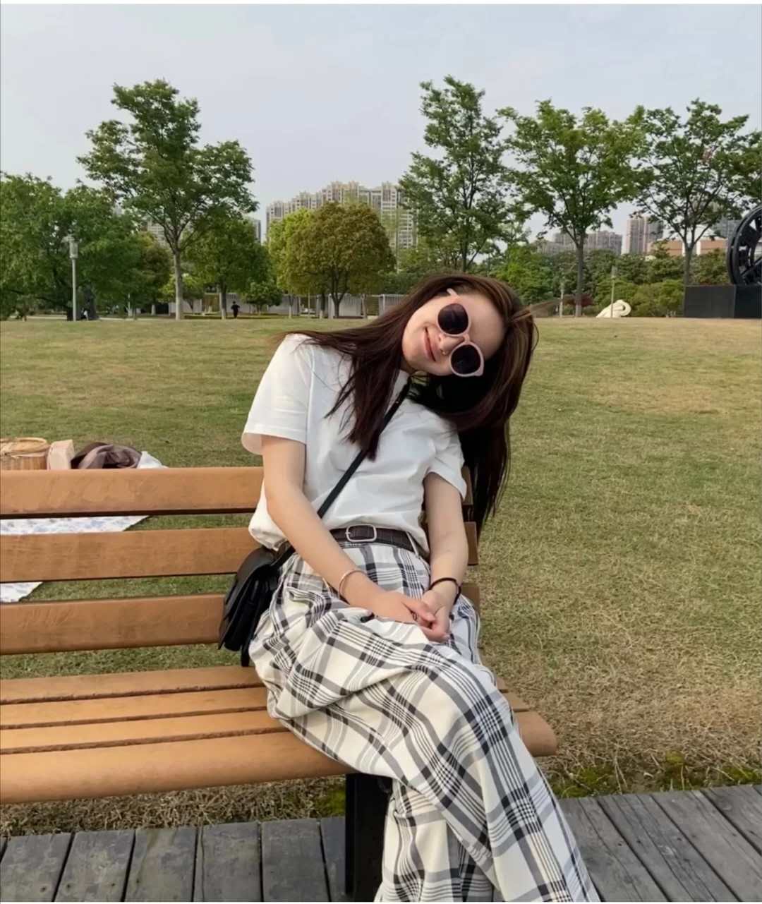 This white T-shirt series is short The sleeve fabric is thicker, the fit is stiff and stylish, the color is a very gentle milky white (not a pure white), it doesn’t feel soft on the body like other short-sleeved shirts, it is very stylish, the shoulder line is also suitable, solid color t must have a textured upper body to look good. Pair it with plaid wide-leg pants for a casual yet fashionable look.