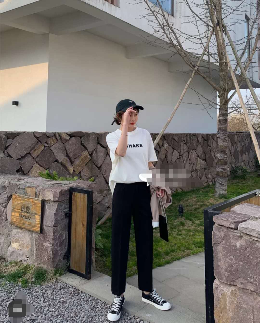 Wear simple and comfortable white clothes in summer T-shirt: This T-shirt is a loose version, not slim-fitting, but feels very comfortable. It is relatively mid-range, with good colors and styles. It is not picky about your body shape. Paired with black harem pants, it makes your skin white and clean. Refreshing, very smart look, suitable for work.