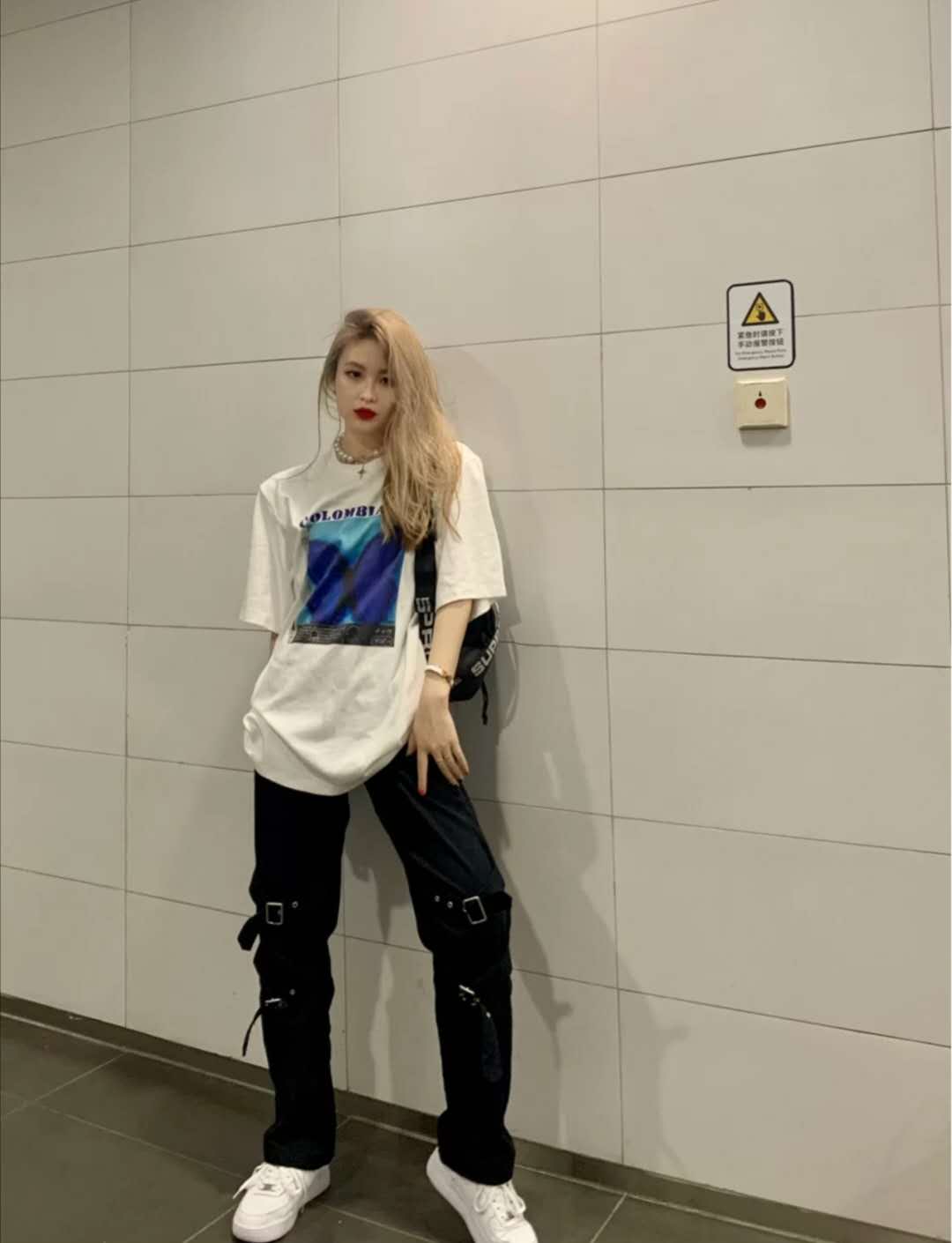 This is a small man Simple Korean-style outfit for girls: a white T-shirt paired with black suit pants, which is simple yet Korean-style. Tuck the clothes into the pants to lengthen the proportions of the legs, which visually makes you look taller. The peaked cap and small chain bag are the finishing touches. Small accessories.