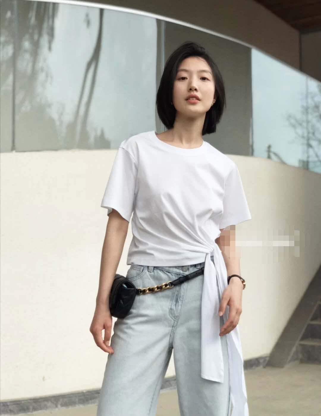 Easy and stylish only You need a white T-shirt: Many white T-shirts on the market will look cheap if they don’t have enough thread count. A high-quality T-shirt will feel more comfortable and skin-friendly when worn. You must buy pure cotton T-shirts. This white T-shirt feels very silky, and the knotted design is more neutral and handsome. It has a somewhat high-waisted design, which I feel is very suitable for petite girls. Paired with a pair of high-waisted retro light-colored denim wide-leg pants and white shoes, it is a simple and fashionable outfit.