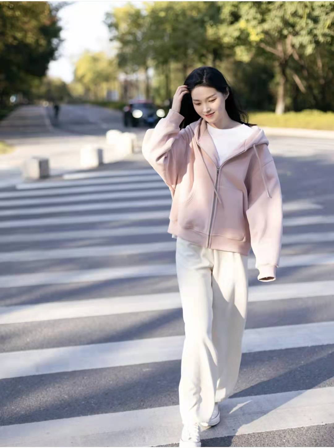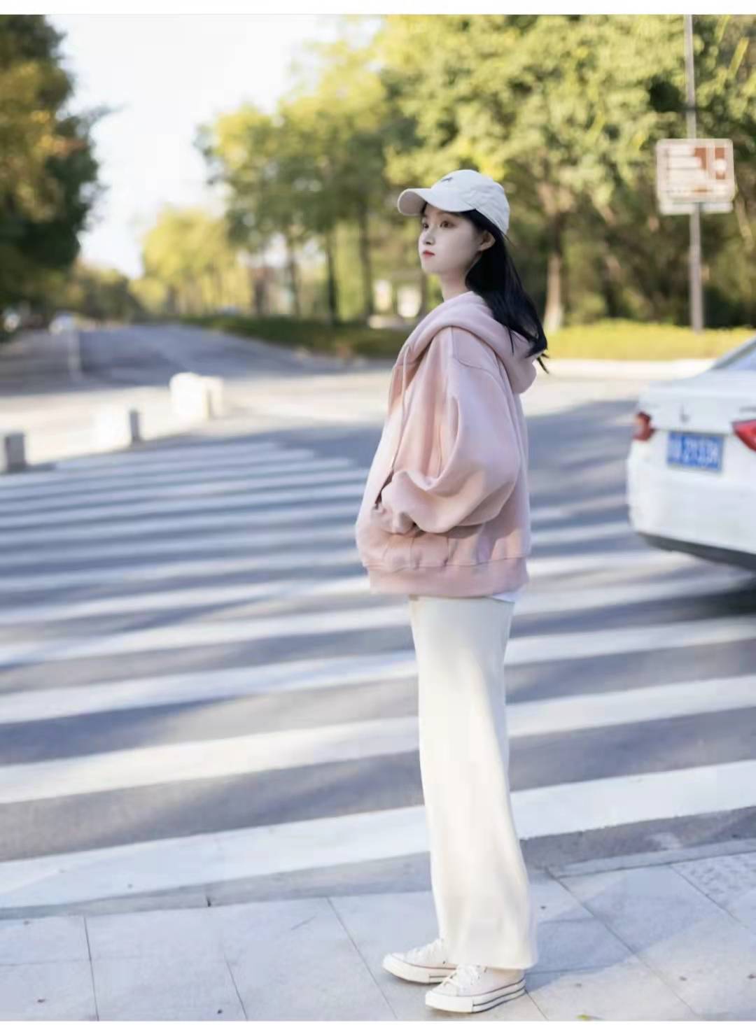 Sweatshirt matching: This clean and refreshing combination is very suitable for spring and autumn. The top is a pink casual hooded sweatshirt, with a white long-sleeved base underneath, and the lower body is white wide-legged Trousers and white canvas shoes, pink + white combination, the whole look is gentle! The pink and tender look makes her look very girly, clean and fair.