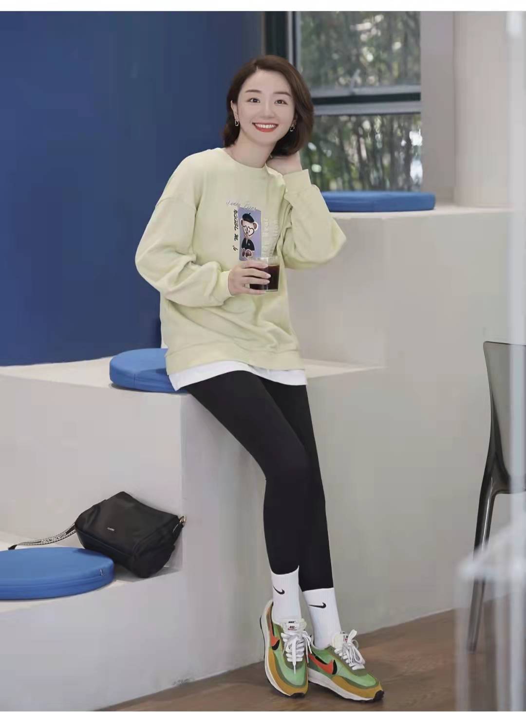 Sweatshirt matching: SpringThe combination of sweatshirt and leggings is also my daily favorite. The top is wide and the bottom is narrow, which makes the legs thin and long. I like to use white T-shirts for sweatshirts. Stacking adds a sense of layering. This piece comes with a white edge design, so you can do it in one piece. The avocado green really shows off your whiteness. Pair it with a pair of colorful sneakers for a super age-reducing look.