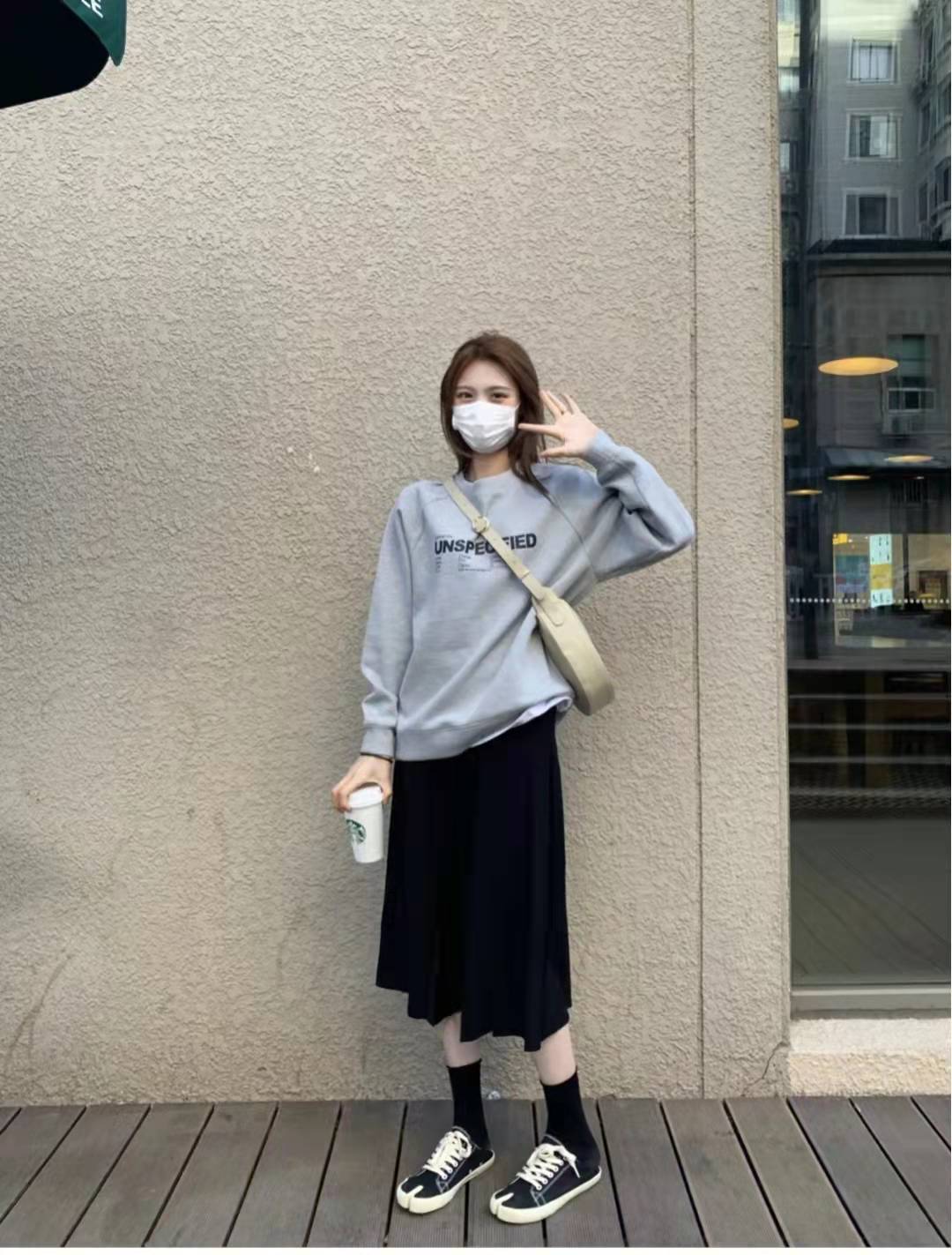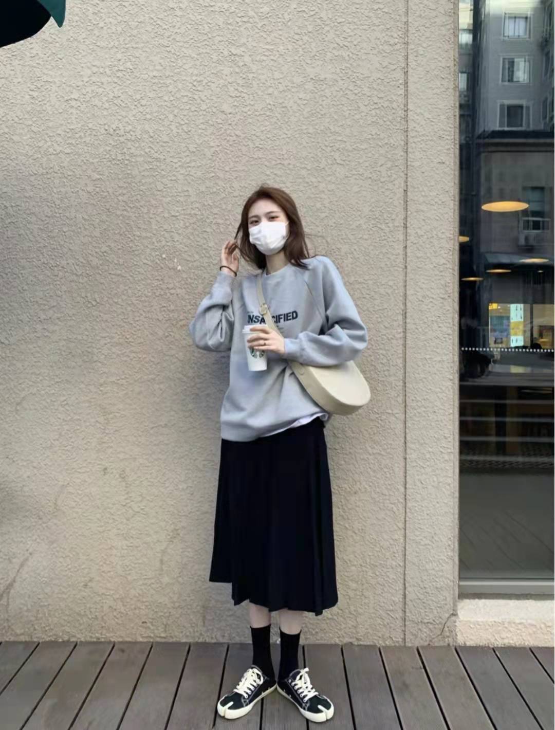 Sweatshirt matching :I love light gray sweatshirts in spring and autumn. This pullover is a must-have for lazy people. It is comfortable and good-looking for everyday use. Pair it with a white T-shirt as a base layer and a black pleated skirt on the lower body for a lazy and casual look. Feeling, this set is very suitable for spring, suitable for daily life or date!