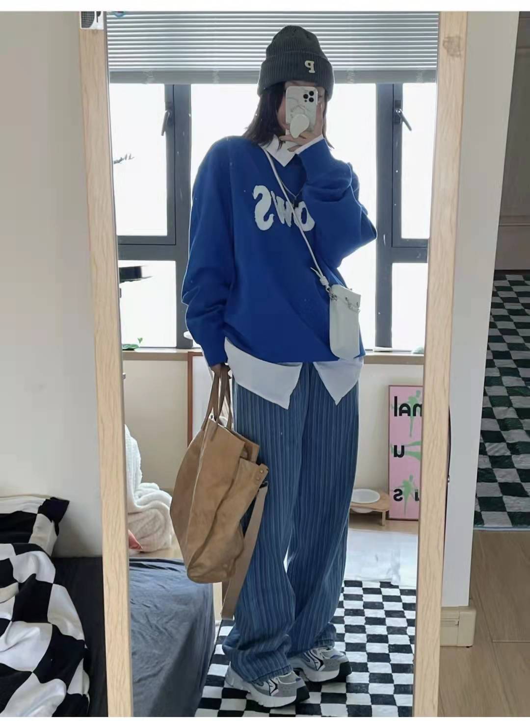 Sweatshirt matching:Love this set! I really like the blue color of the sweatshirt, which makes it look incomparably white. The lower body is paired with a pair of wide-leg pants of the same color. It is casual and chic. It is still a layered shirt. Of course, a cold hat is also indispensable. The overall tone is white and blue, casual and simple. Keep your sense of fashion!