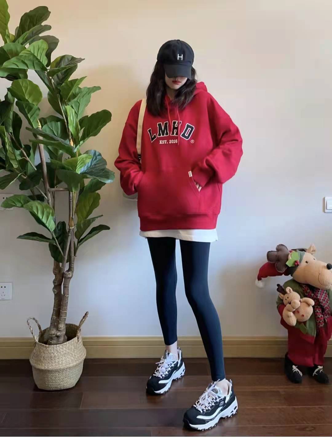 look5 red sweatshirt + white long T + black leggings + dad shoes