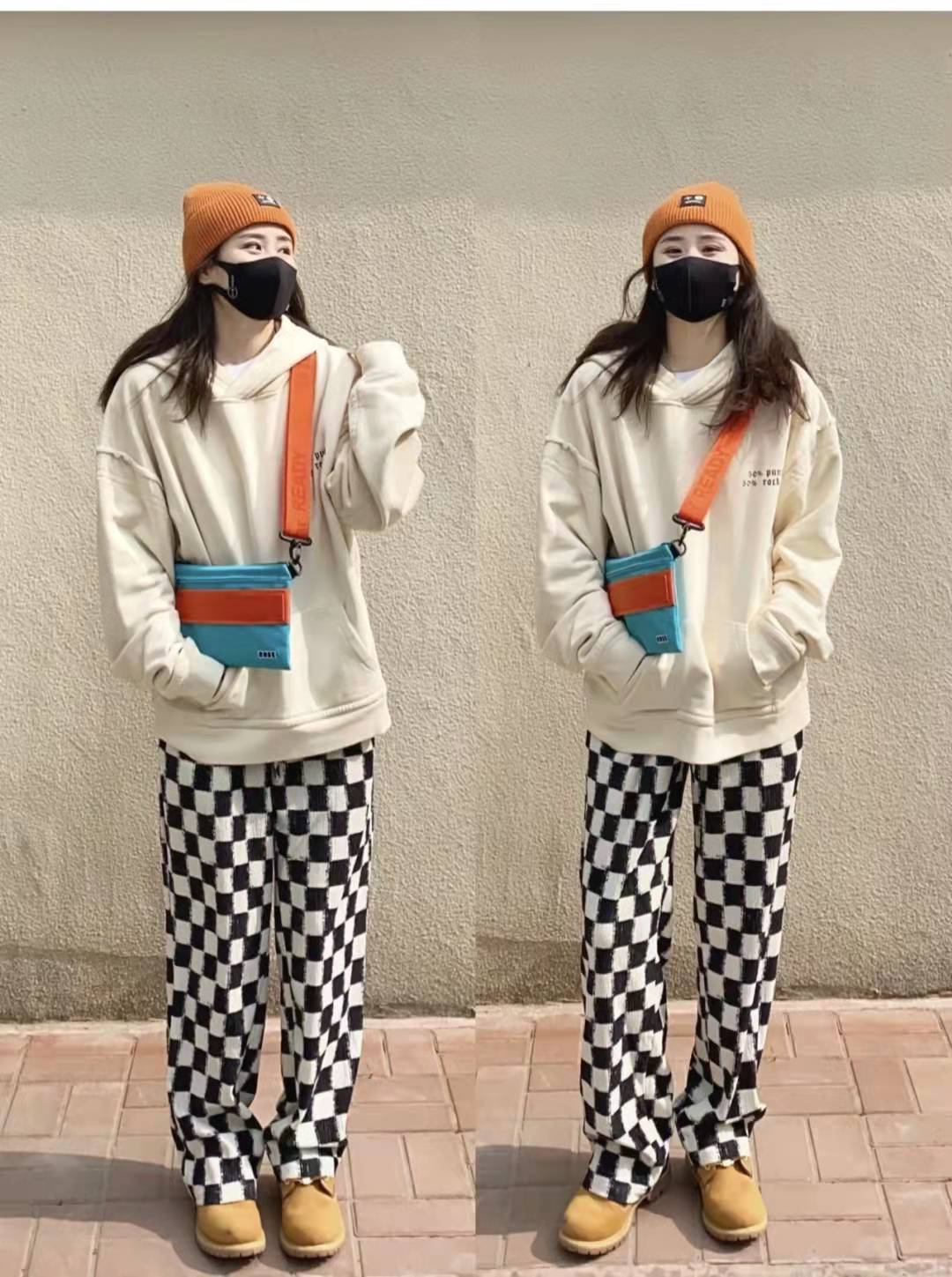 Sweatshirt matching:The off-white sweatshirt fabric is thicker than ordinary sweatshirts. I like the rock checkerboard print on the back. There are various small details on the shoulders. The hooded one is more casual. , wearing a white T-shirt underneath, and the lower body is checkerboard straight-leg trousers, which are quite special suede checkerboard trousers with a certain thickness and good drape. On the feet are classic rhubarb boots.