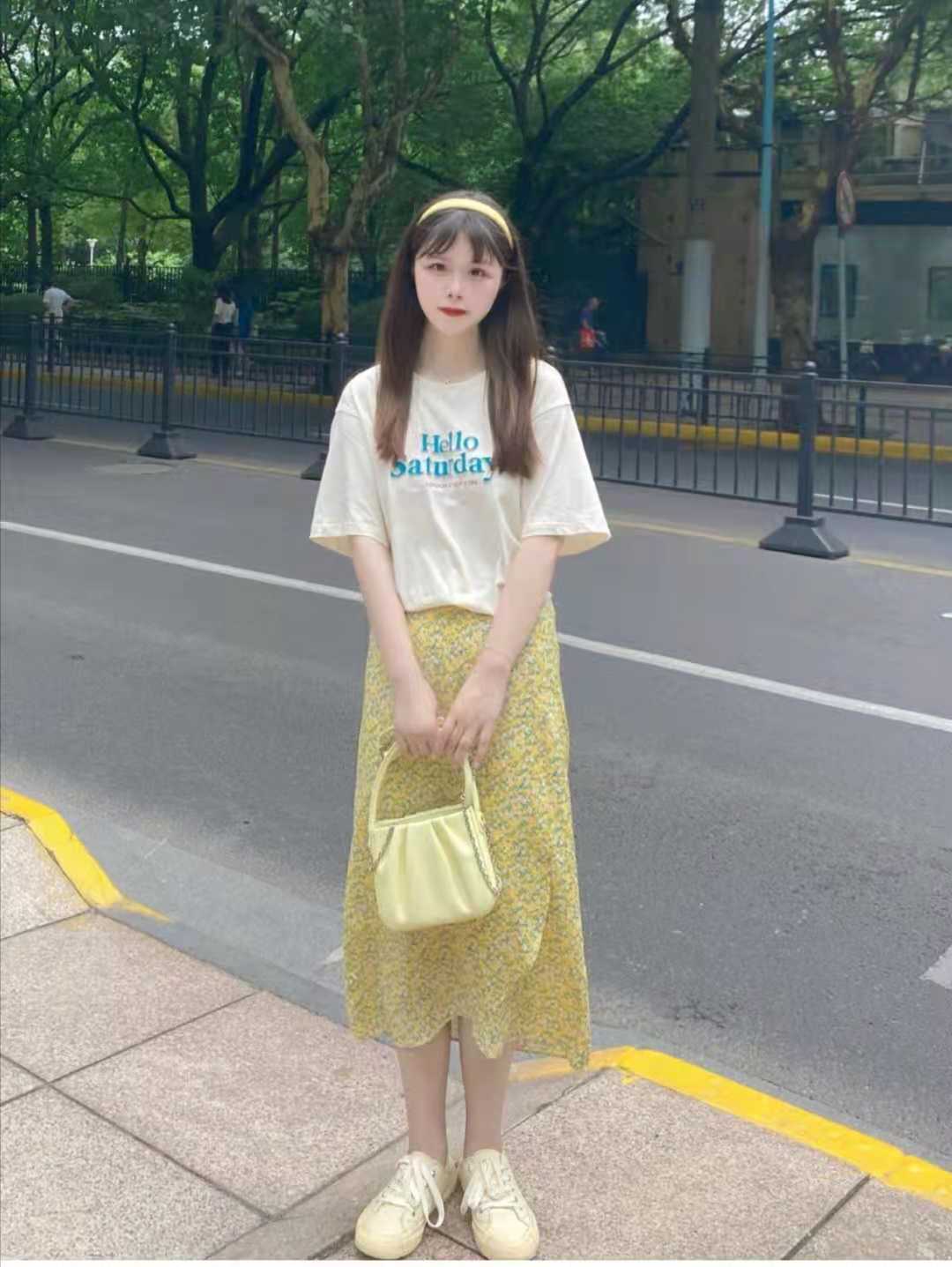Summer T-shirt wear: Hot summer is definitely inseparable from floral flowers, this Korean style is gentle. The light green half-sleeved T-shirt is gentle and tender, and the blue letter print is three-dimensional and very special. The lower body is paired with a romantic and white green floral skirt, and dirty white shoes are worn on the feet. .