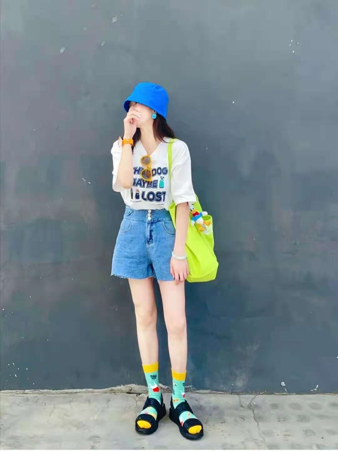 Summer T-shirt outfit: This outfit is fashionable in summer with contrasting colors. It is a white printed short-sleeved T-shirt that is not tired of wearing. The half-sleeves can block the bye-bye sleeves. The Western letter cartoon print makes the clothes comfortable. Skin friendly. Pairing the lower body with high-waisted denim shorts is too slim. The buttoned high-waist design lengthens the waistline and makes the legs better proportioned. The washed blue style is fashionable.