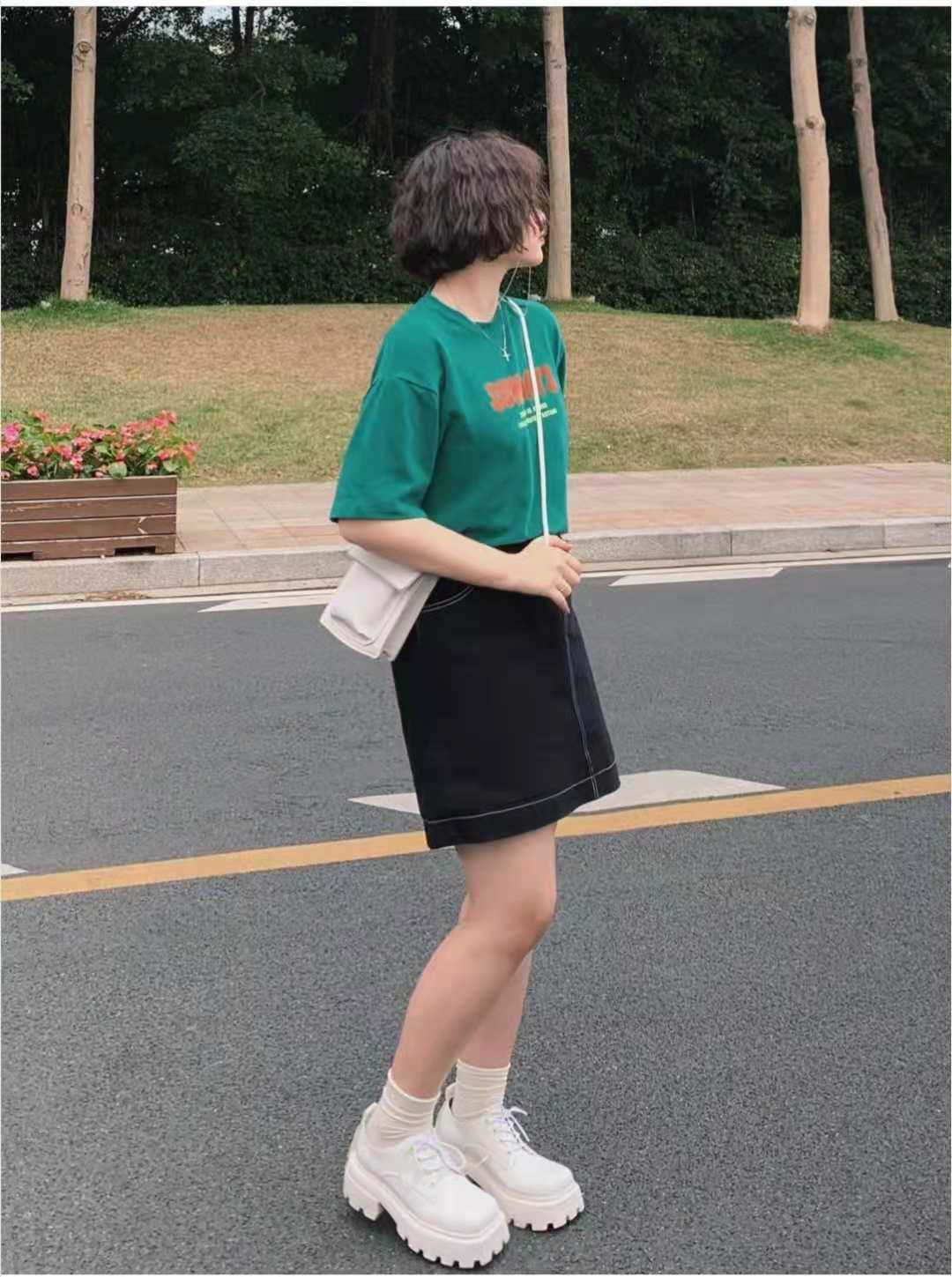 look4 green loose half-sleeved T-shirt + black A-line high-waist denim skirt + thick-soled small leather shoes