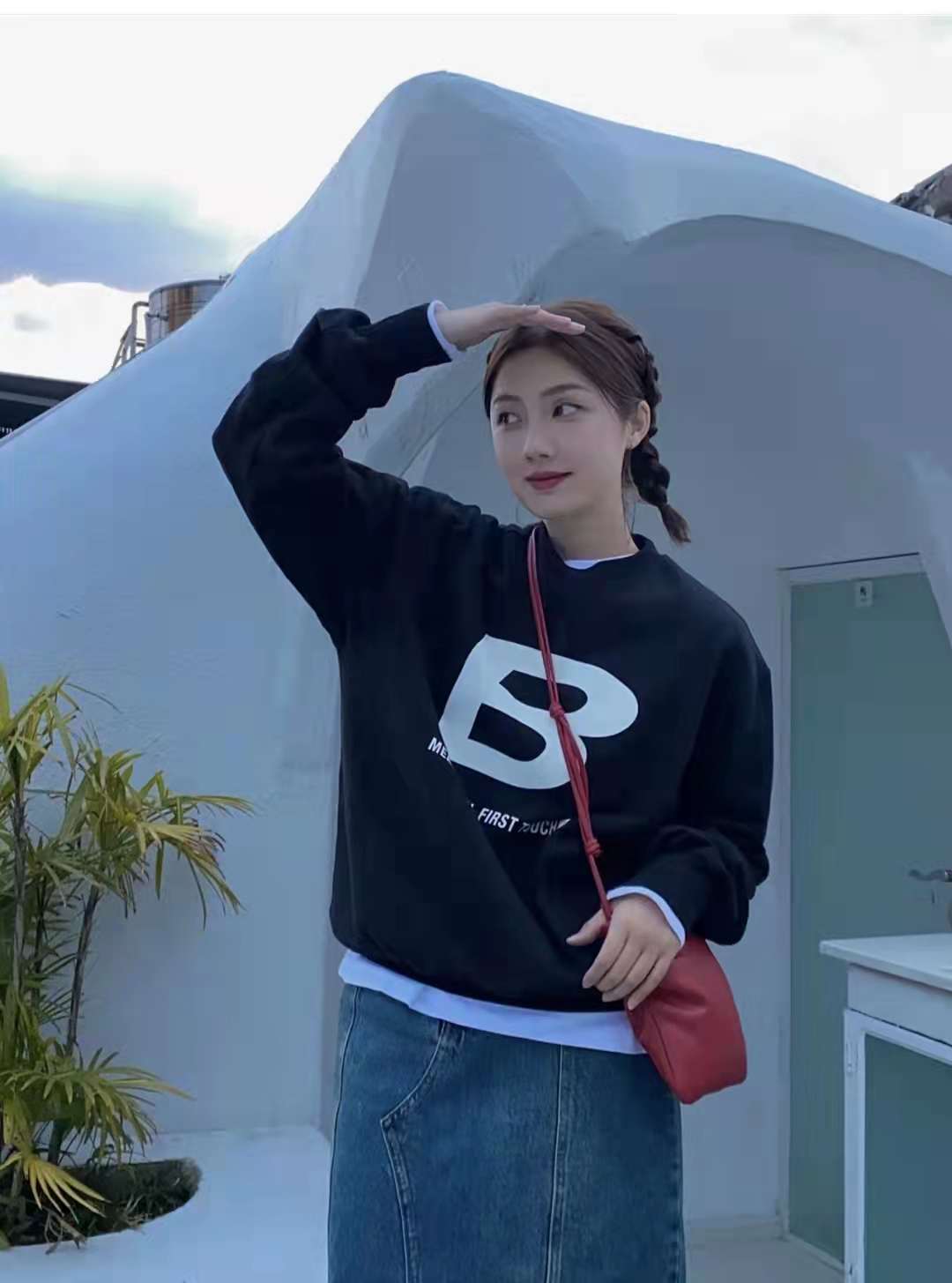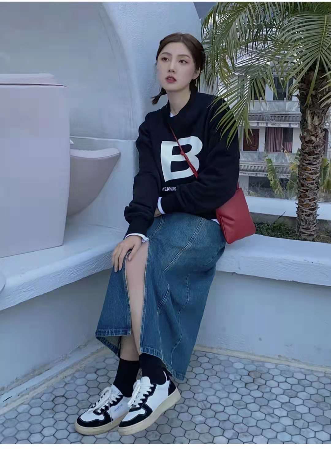Sweatshirt outfit:How can you wear a spring outfit without a sweatshirt and a skirt? Who doesn’t love a casual and age-reducing outfit? The black sweatshirt with this look has a fashionable letter B print. It is paired with a white T-shirt to increase the visual sense. The lower body is paired with a blue denim slit skirt + sneakers. The set is fashionable and eye-catching when going out on the street.