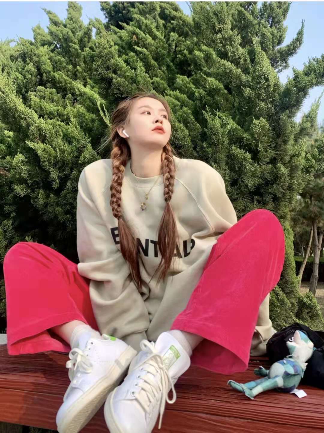 Sweatshirt outfit:The mustard green sweatshirt is so spring-y. I prefer mustard green to those gray, gray, and brown colors. It is the color of a spring sweatshirt, paired with retro corduroy. Rose pink pants + white shoes are so beautiful
