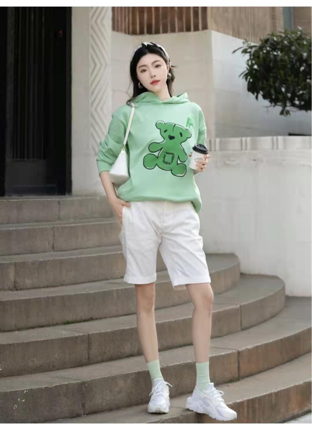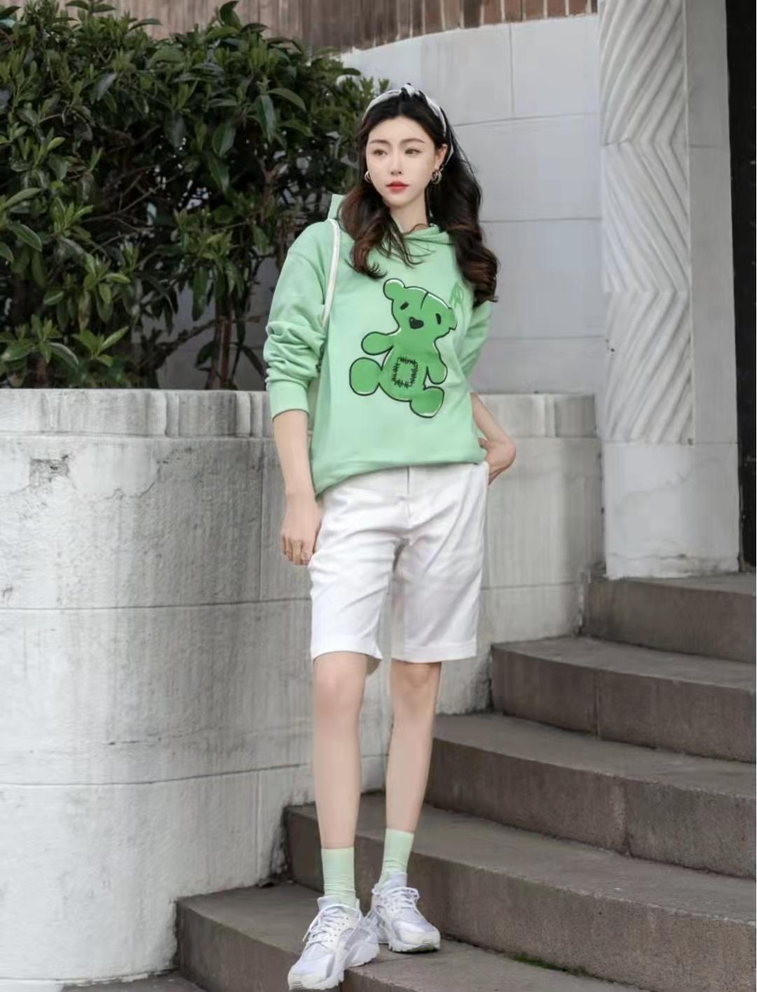 Sweatshirt outfit:The color of this sweatshirt is a relatively small and fresh green, which is reminiscent of mint-flavored colored hard candies. The oversized version adds a lazy and casual feeling, and it is paired with white The three-quarter length pants have a more Japanese and clean style, and a pair of the most classic white sneakers give it a youthful look. Paired with socks of the same color, it emphasizes the presence of the color of the sweater, and the overall look will be more energetic and younger.