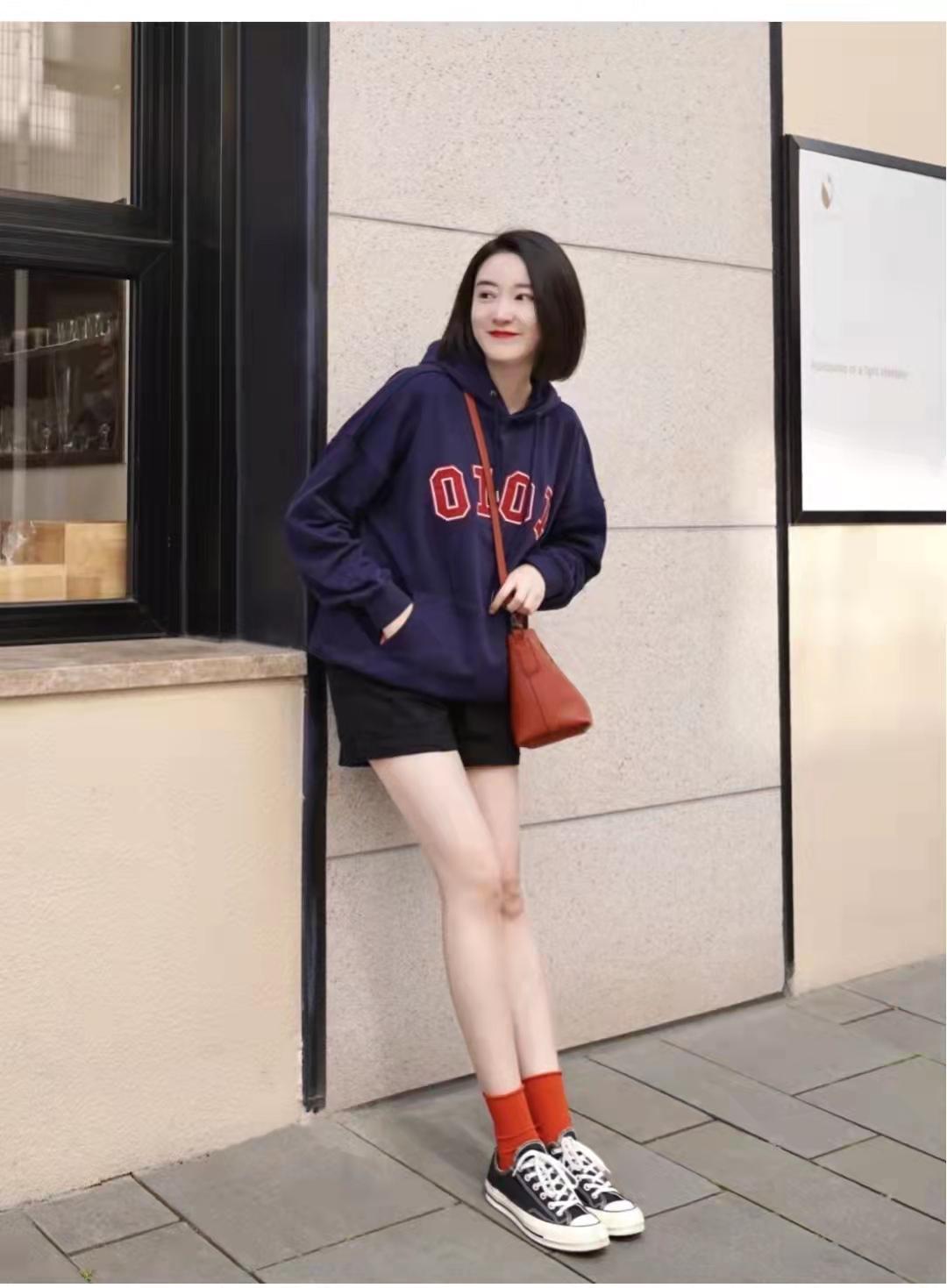 Sweatshirt outfit:The length of the orange sweatshirt can cover the pp. It has a cool printed pattern on the back. Although it is a loose version, it does not look thick on the back when viewed from the side. It is moderately thick and is super comfortable to wear. ; The black shark pants paired with the lower body look very slimming, and the butt-lifting effect is very satisfactory. The high-waisted version also has a waistband, which hides all the flesh.