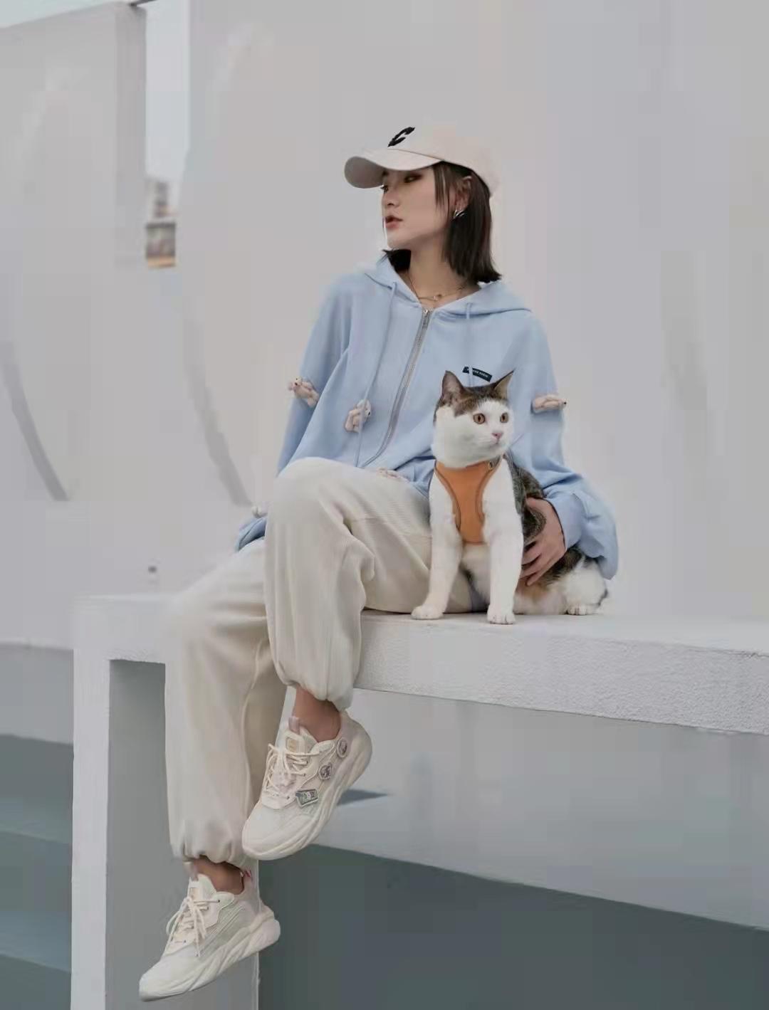 Sweatshirt outfit:Casual and comfortable sweatshirt, sweatpants and sneakers, baby blue cardigan sweater with many little bear dolls crawling on it, cute and headless, paired with beige sweatpants, all loose The shape is visually very slim, and the shoes are also matched with beige colors, which feel soft and comfortable when worn.