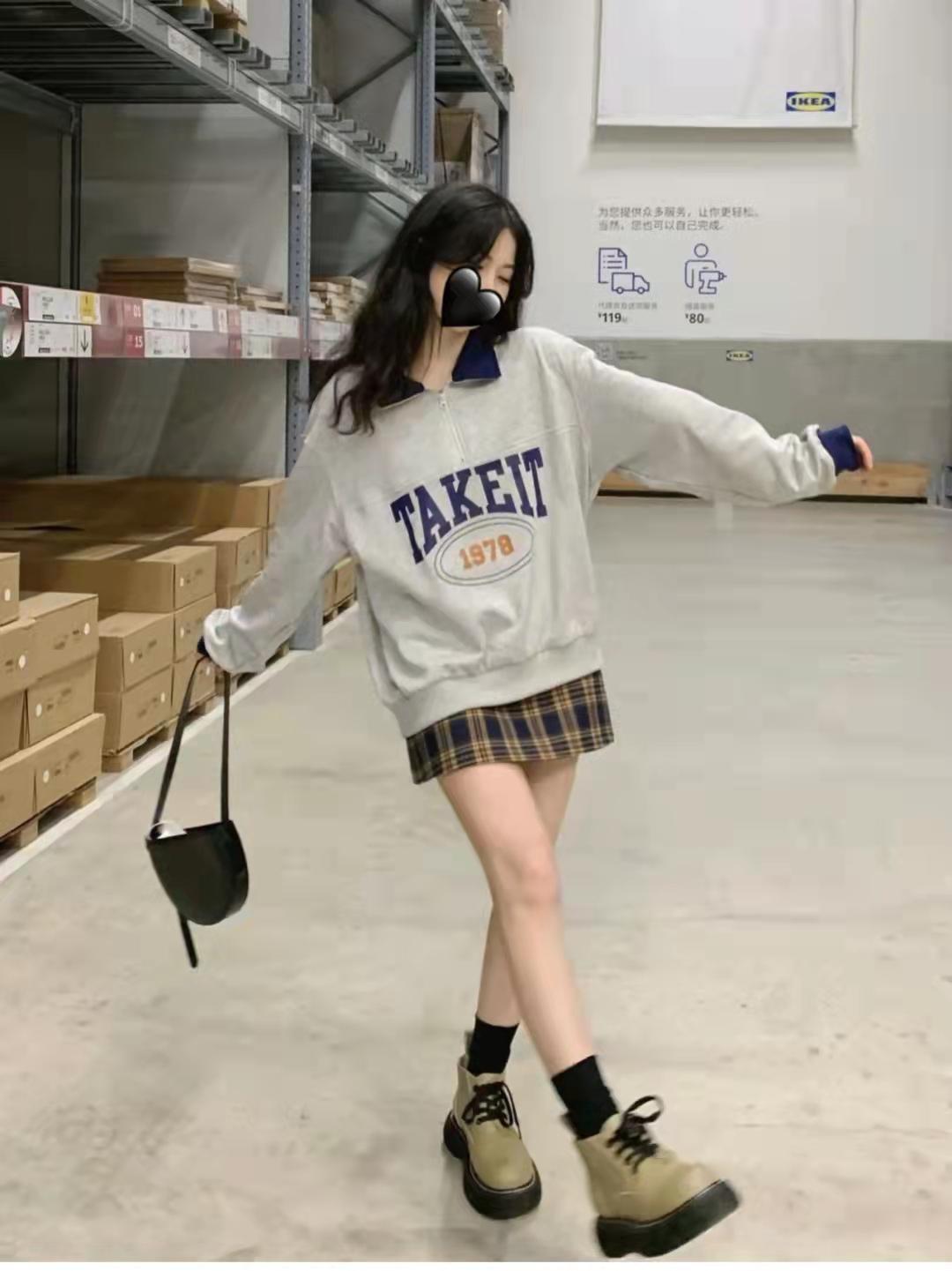 Sweatshirt with skirt: this oneThe gray sweatshirt is not picky about skin color. The design of the polo collar is very special. The collar and cuffs also have letter prints that echo each other. The lower body is paired with a plaid skirt and a green Martin A set of boots, playful and cute, very suitable for young sisters.