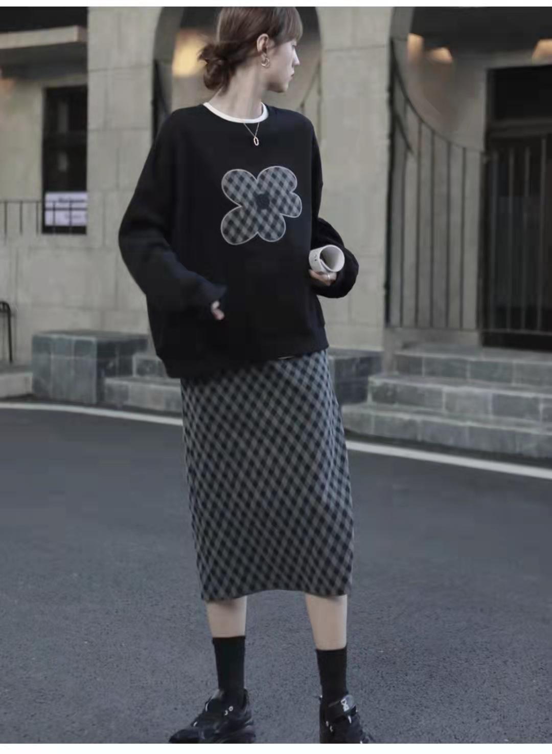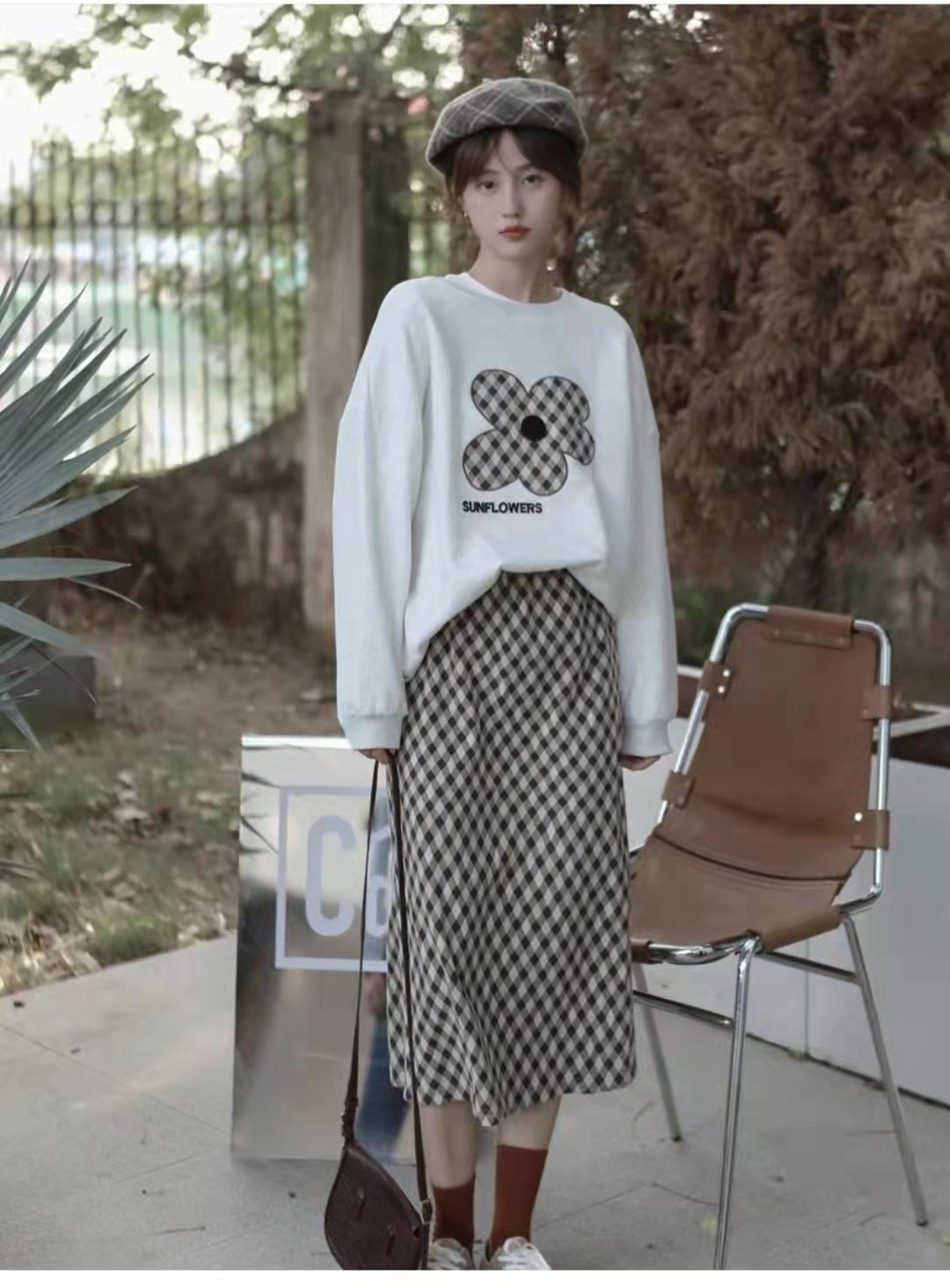 Sweatshirt with skirt:The combination of sweatshirt + skirt suit is worry-free and comfortable, and is a must-have for lazy people. Compared with ordinary sweatshirt and pants suits, the skirt suit is more Korean style, and the skirt also covers the flesh. Proportions, slimming yyds. The floral pattern on the chest and the plaid pattern combine to create a sense of fun and fashion. The skirt and the floral plaid are made of the same material, matching each other as a set, making it look non-stiff.