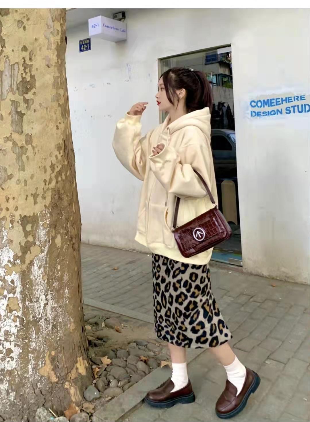 Sweatshirt with skirt:This set is very Korean. The color of the cream sweatshirt is really exciting. The size is too large and has a lazy feel. The leopard print skirt that matches the lower body feels very soft. , and super eye-catching and fashionable, with small brown leather shoes and white socks on her feet.