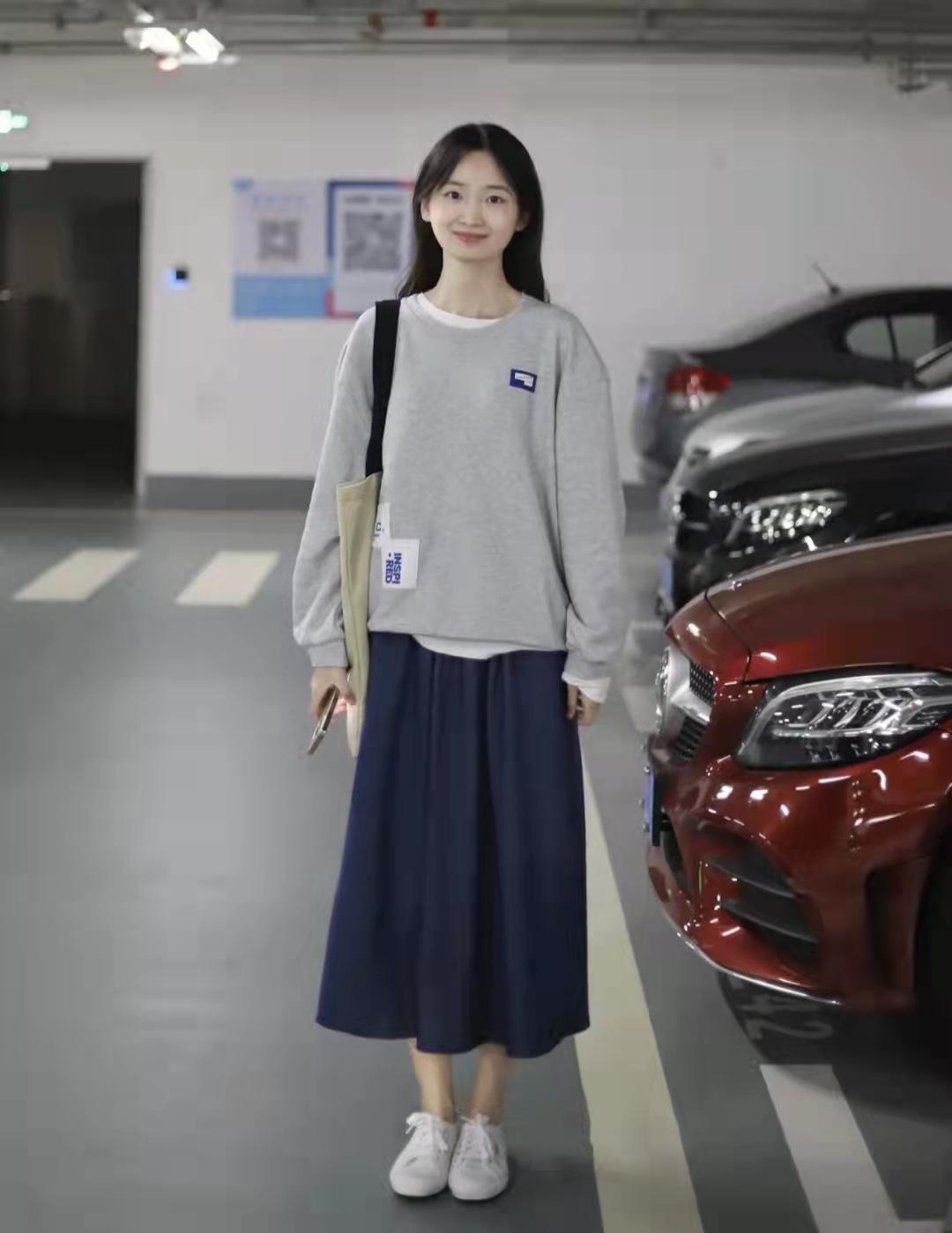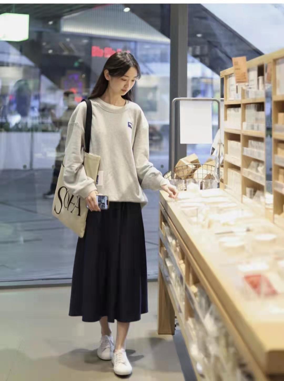 Sweatshirt with skirt :For a refreshing and handsome boyfriend style, learn from the matching colors in boys’ wardrobes to find this cold and clean dark gray! It has a more high-end feel. The loose sweater paired with an apricot skirt is eye-catching, and you can get casual in one second. Is the workwear style attractive?