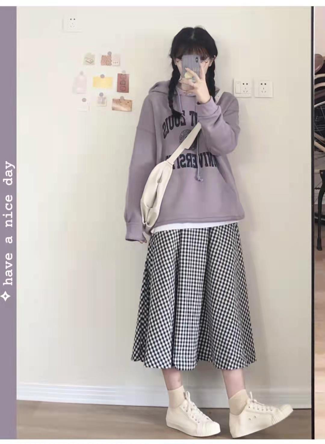 Sweatshirt with skirt:The color of the gray and purple letter sweatshirt is really super nice and very white! The fit is not very loose, it looks just right, and the letter design on the front also adds a bit of specialness). The lower body is paired with a plaid skirt. It is a versatile plaid skirt. The overall color system is very bright and comfortable, and it is super everyday.