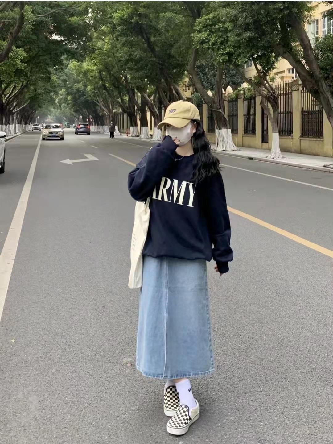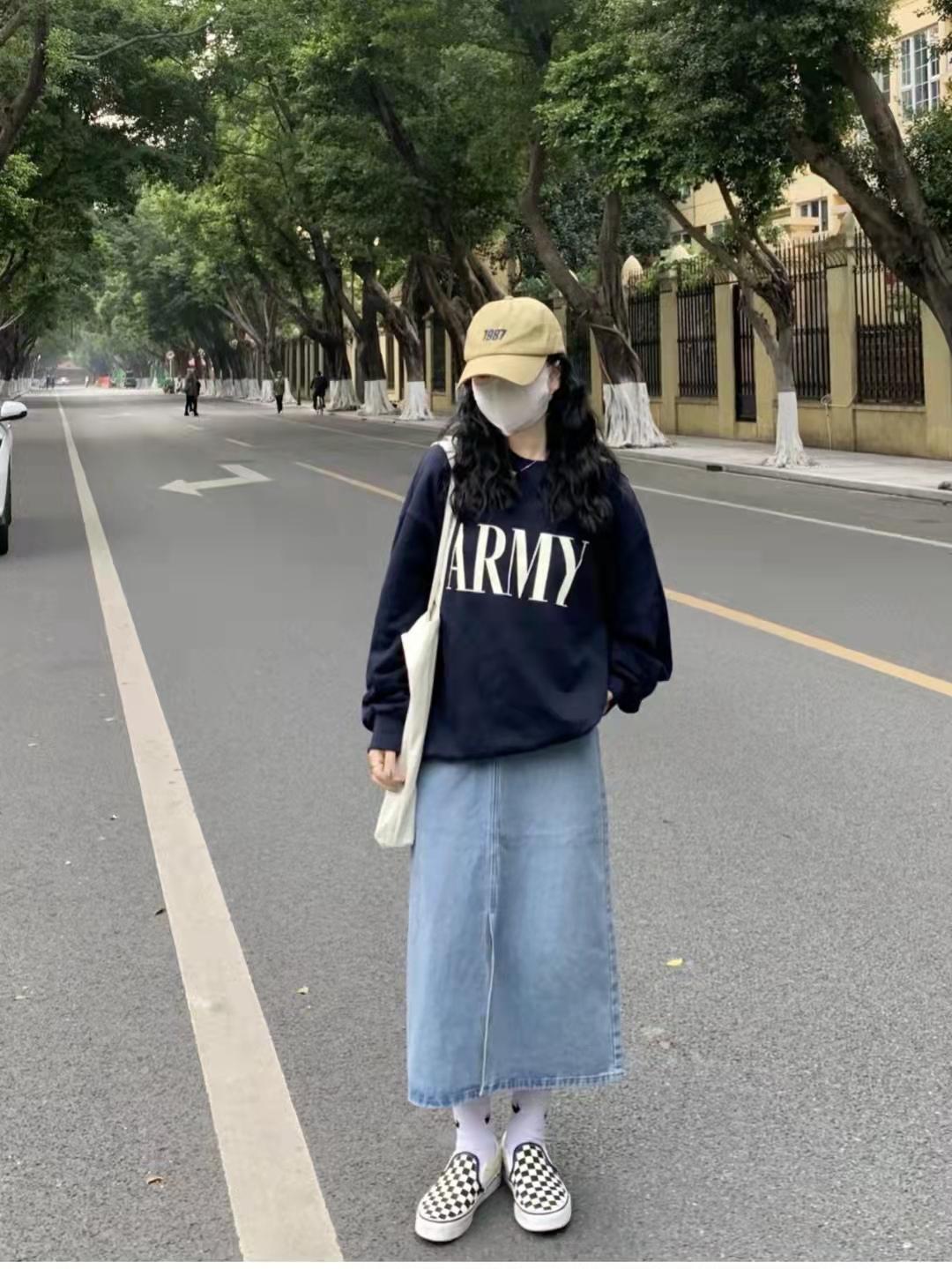 The lower body is matched with a light blue denim skirt with front slits. The skirt has a great shape. When paired with a sweatshirt, it lengthens the body proportions. The A-line shape is very slim and is very suitable for sisters with pear-shaped figures. The checkerboard canvas shoes on the feet add the finishing touch to this outfit.