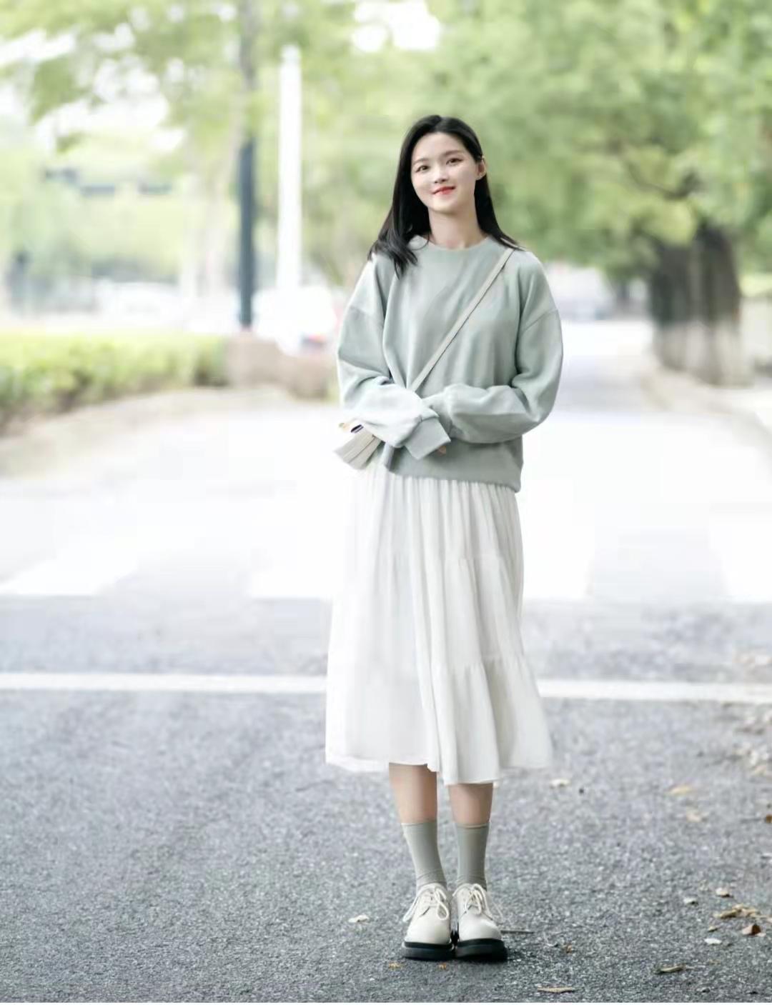 Sweatshirt with skirt:The mint green upper body is really beautiful. It has a fresh smell and looks very gentle. It is comfortable and not tight when worn alone. The lower body is too small. A white skirt and white lace-up leather shoes give a clean and girly look.