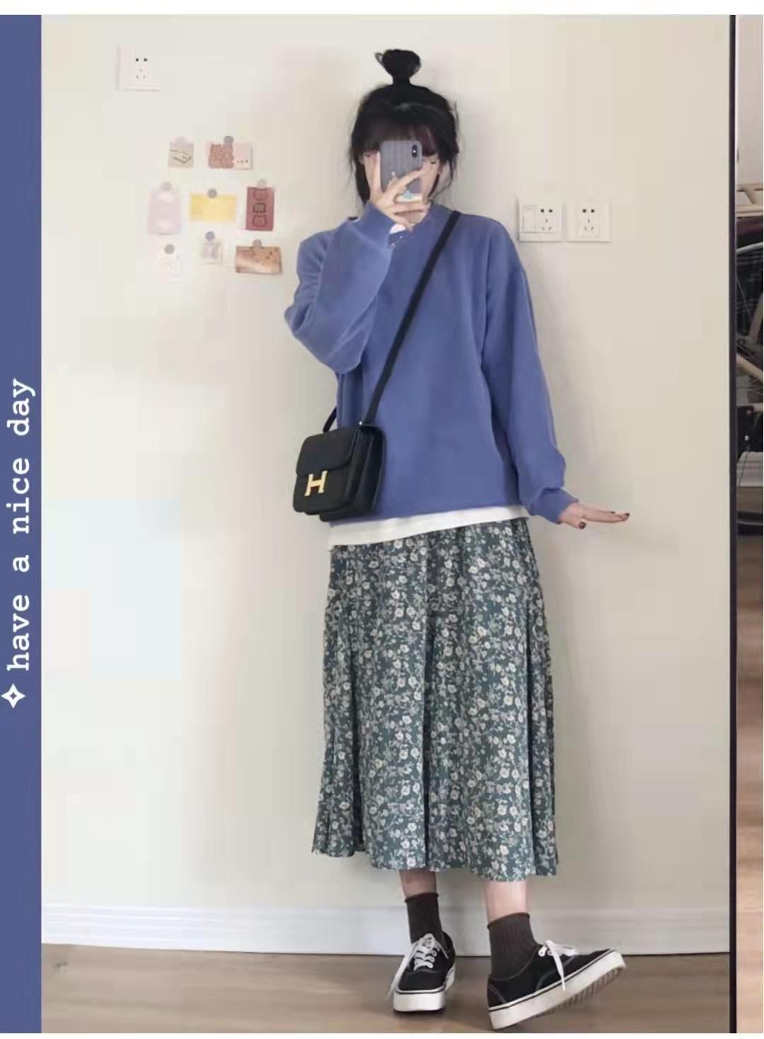 Sweatshirt with skirt:The blue and purple solid color sweatshirt fabric is quite special. It feels like a little corduroy. It is soft and very comfortable. The blue and purple ones cannot be white. The color is even more white, with a white T-shirt underneath and a green floral skirt on the lower body. The contrasting colors are not abrupt at all, and have a different feeling, which is both daily and good-looking.