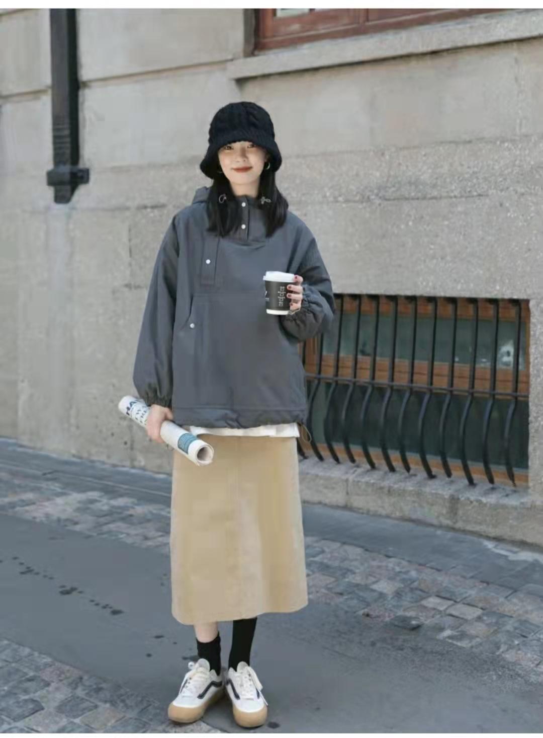 look5 dark gray workwear sweatshirt + white T-shirt + apricot skirt + canvas shoes