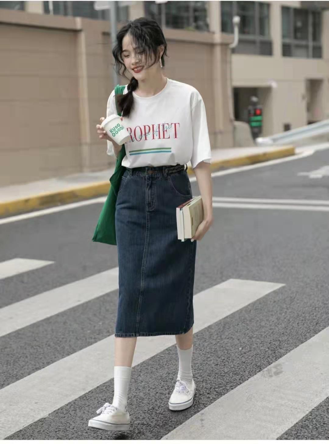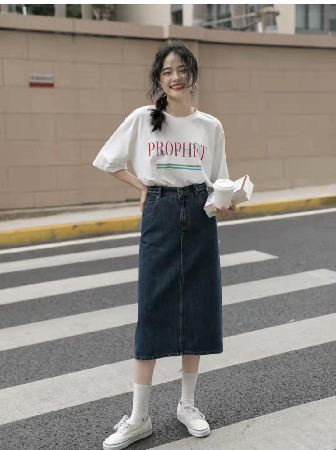 Simple and clean Korean style, white letter T-shirt + denim skirt + canvas shoes, although They are all basic items, but they still look good when put together. The silhouette of this denim skirt is very slim. It can be worn by sisters with pear-shaped figures or unsightly legs. There is also a small twist design at the waist, which can be exposed if worn at the waist. It has an extra feature. Sweet feeling.