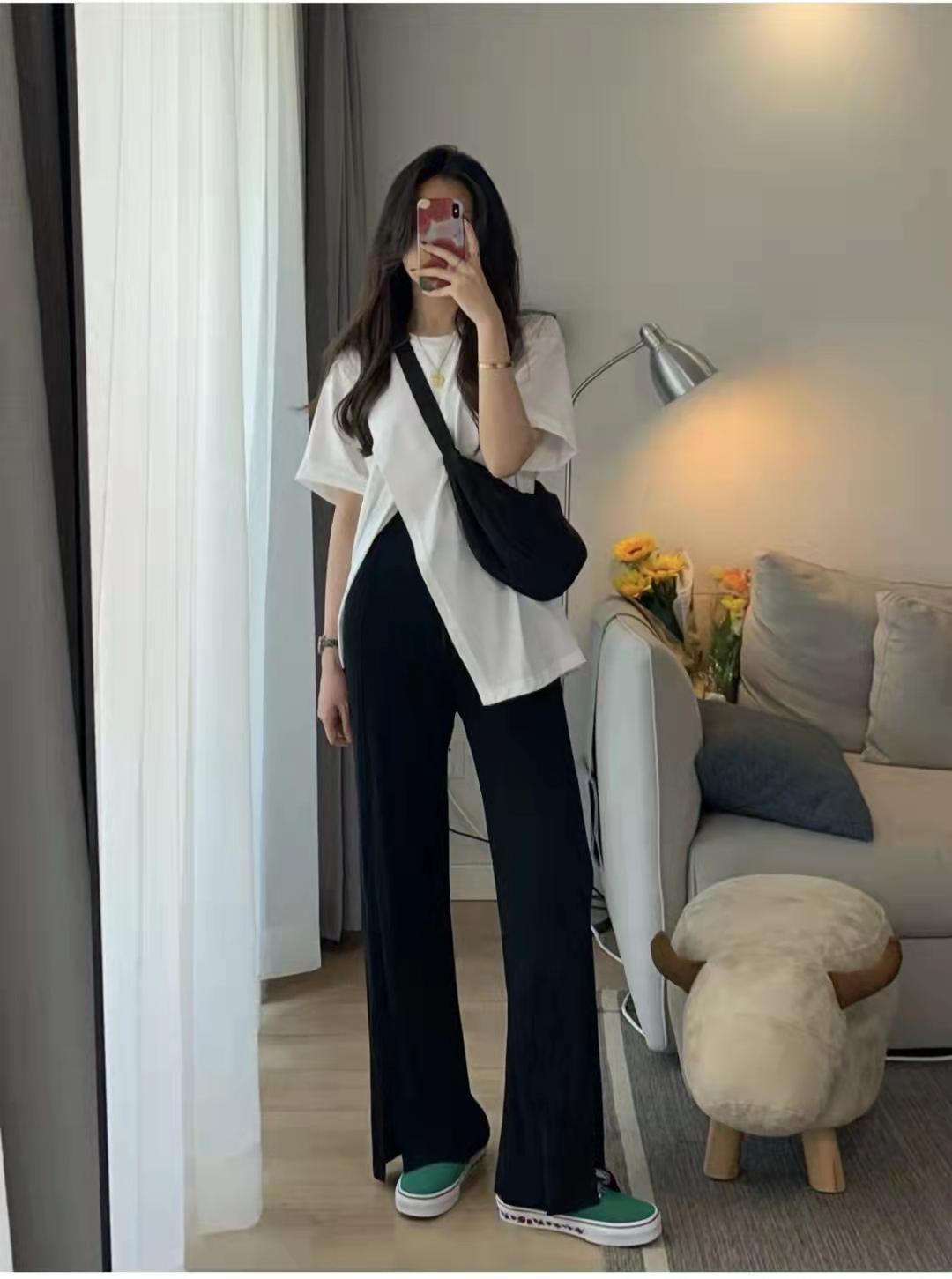 The casual and lazy outfit is super comfortable, this white T-shirt is simple But it still has a sense of design. This kind of slit covers the crotch and highlights the waistline. Simply paired with black high-waisted wide-leg pants and canvas shoes, and a black crossbody bag, the set is fashionable and comfortable, and is very suitable for the coming days. summer.