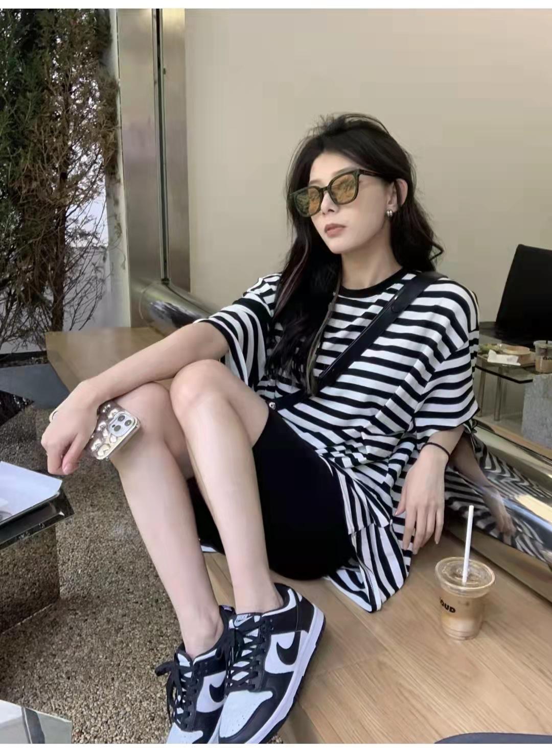 Striped big T-shirt with black cycling pants. I like this comfortable outfit so much. I paired it with a pair of Panda AJ+ Mr. Wu’s glasses of the same style are for trendy and cool girls. The striped T has small details and a small waist design, so it should not be too eye-catching when out on the street.