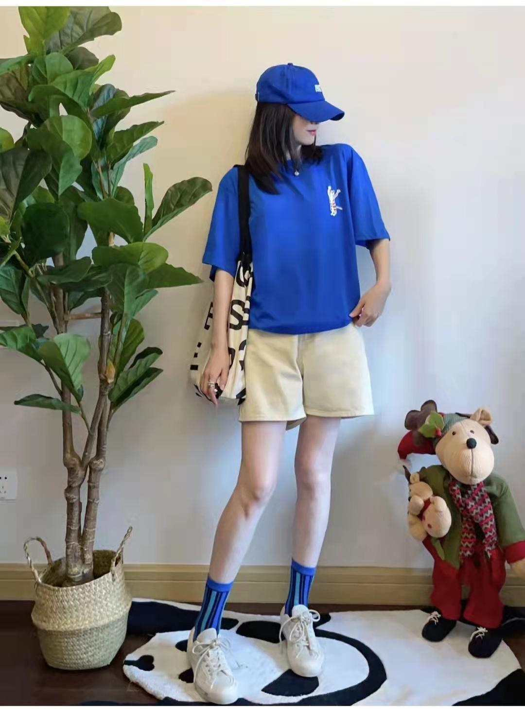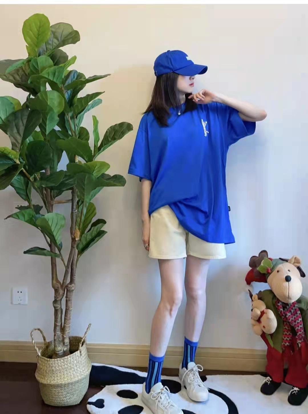 The sapphire blue T-shirt is really beautiful, and it is always a white color. This T-shirt has a loose fit, which can be worn as a skirt or tucked into pants. It is clean and simple to wear A-line off-white shorts underneath, and socks to match the T-shirt.