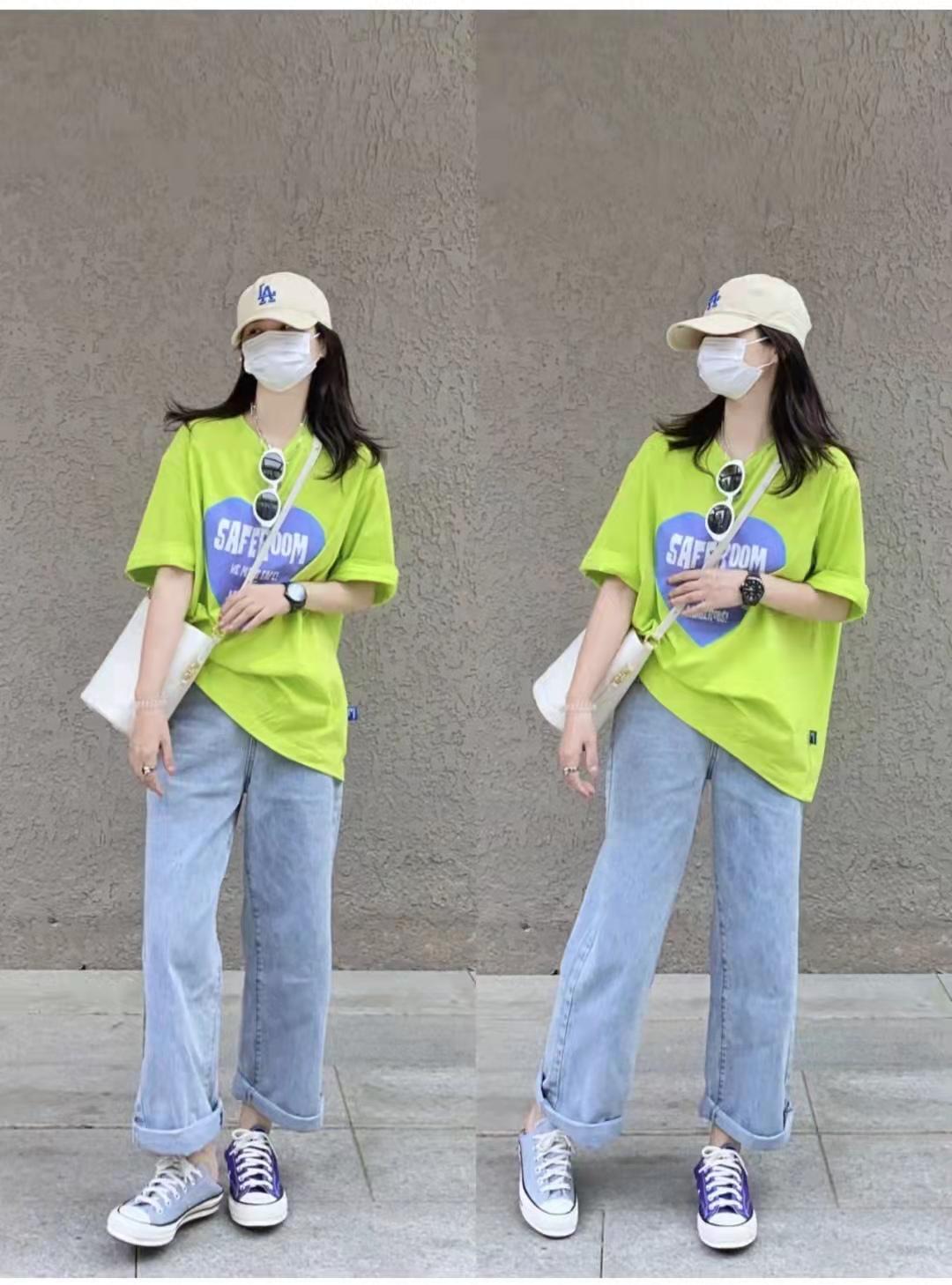 Colored T-shirts make boring summer outfits more exciting, and the love-printed short-sleeved yellow ones The combination of green and blue-purple hearts looks really nice. It’s a special list. Pairing the lower body with soft light blue jeans is suitable for summer. It’s refreshing and refreshing. The pants can be worn without hemming and the trousers have a loose boot. I like this version, even the shoes. They all chose pink and blue mandarin duck shoes.