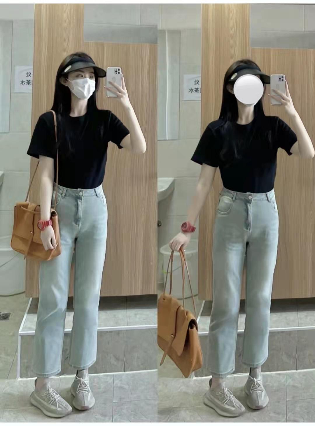 In summer, I like simple matching, the upper body is comfortable and generous, and when matched properly, it also shows off your temperament. I chose a black T-shirt for this top, and my lower body is made of light pink and white straight jeans and coconut shoes. The color of these pants is very special. I like to tuck the T-shirt into the waistband to show off my body proportions.