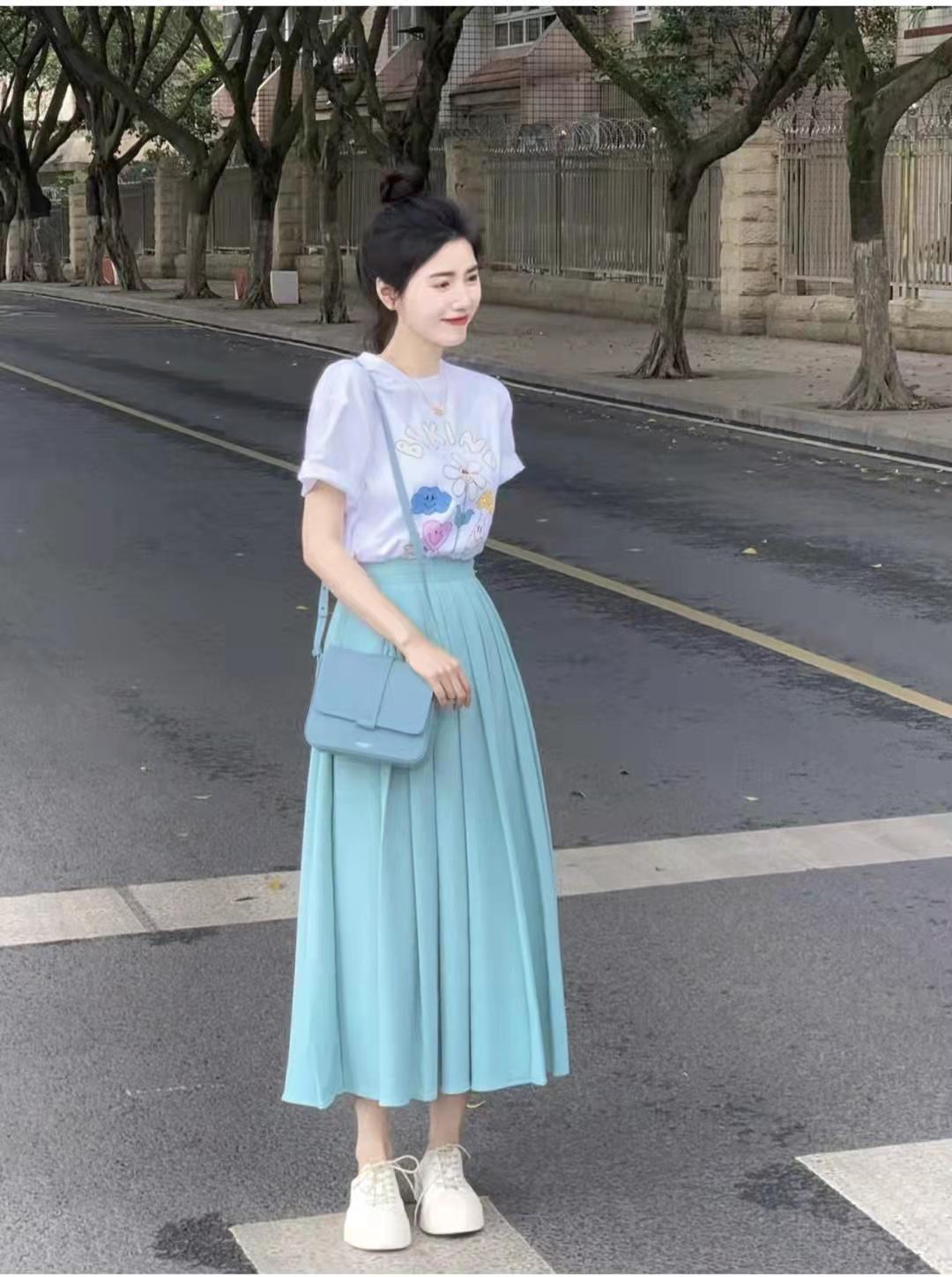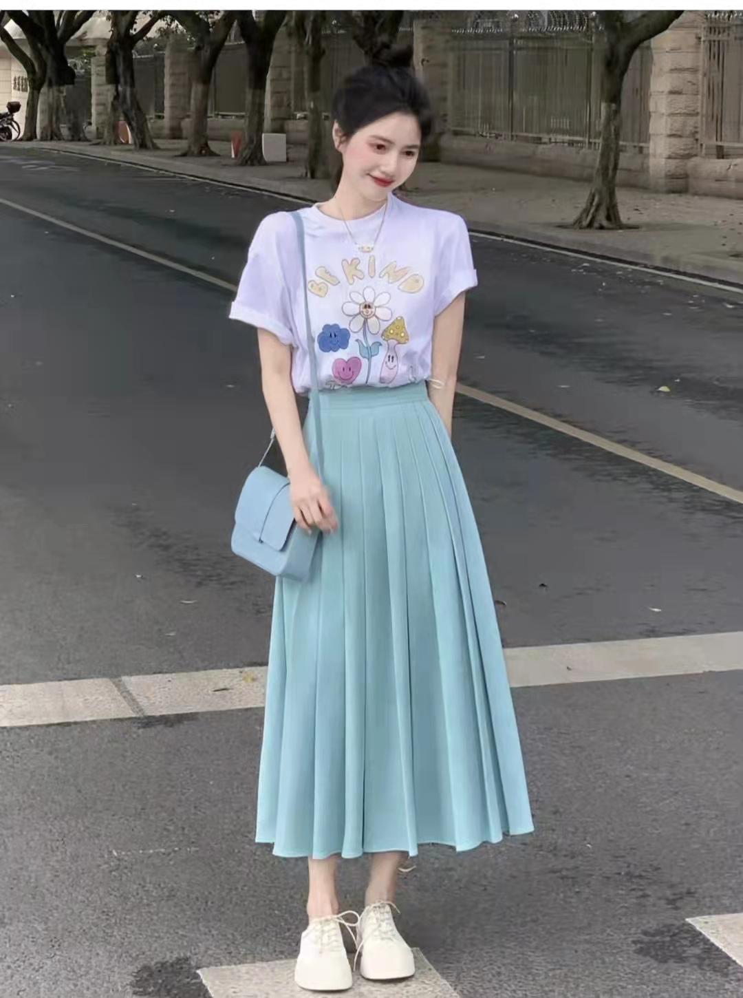 I feel like I can already smell summer and I can finally wear it I have the short-sleeved T-shirt that I have longed for. This is the creamy T-shirt that I have been looking for. The bright color combination makes it look white and eye-catching in the crowd. The lower body is paired with a high-waisted gray-pink pleated skirt and white shoes. This set will reduce your age. The stylish matching is completed.