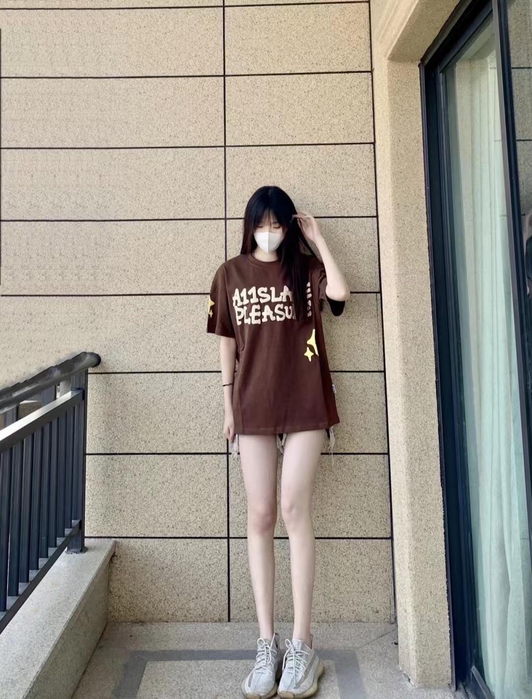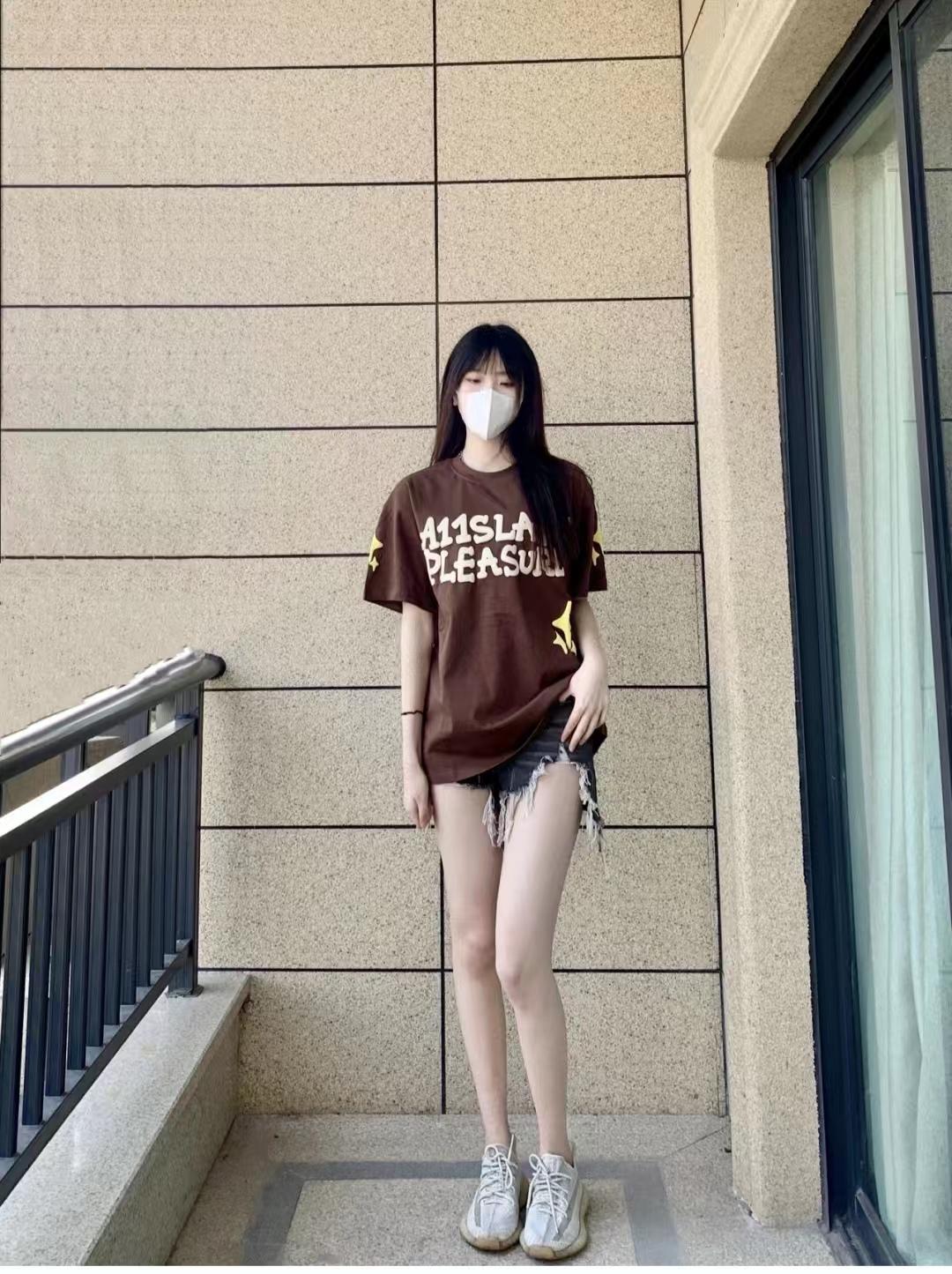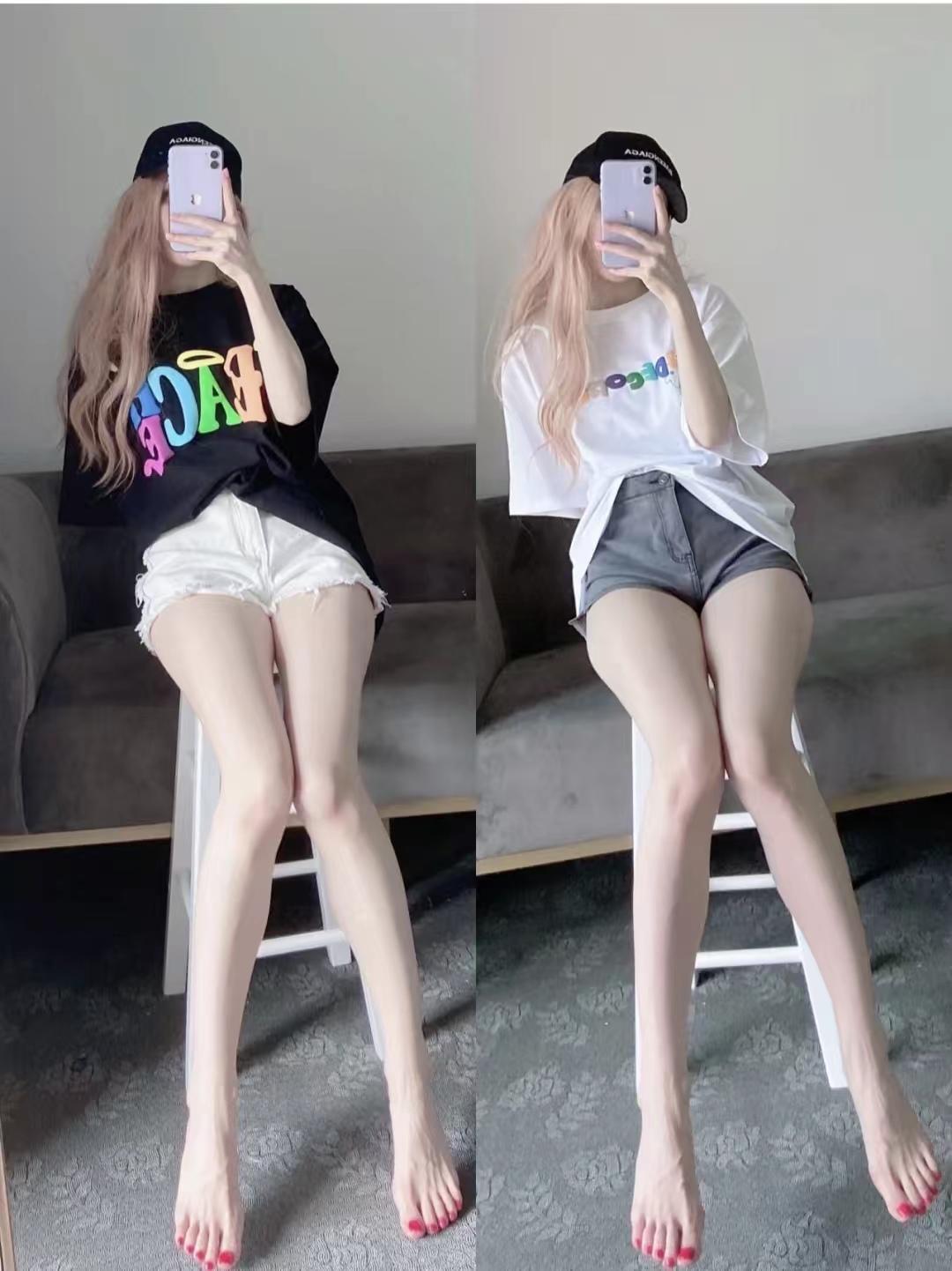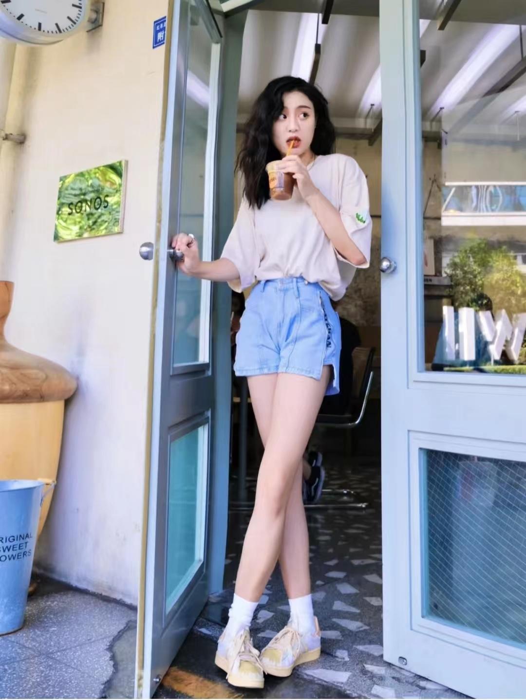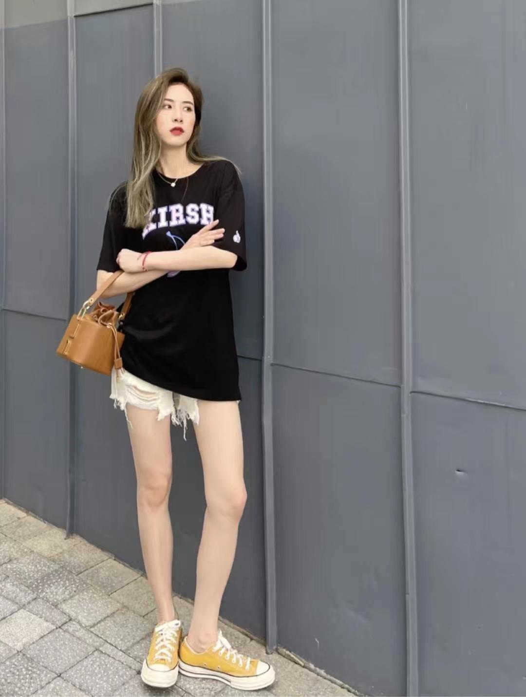 I love the combination of a short-sleeved T-shirt and short jeans, it looks so long! I like the short sleeves with the letter pattern, and the half body and quality are very good. The brown upper body is very white, and the lower body paired with shorts is a complete combination of missing power bottoms. It is easy to wear comfortable coconut shoes.