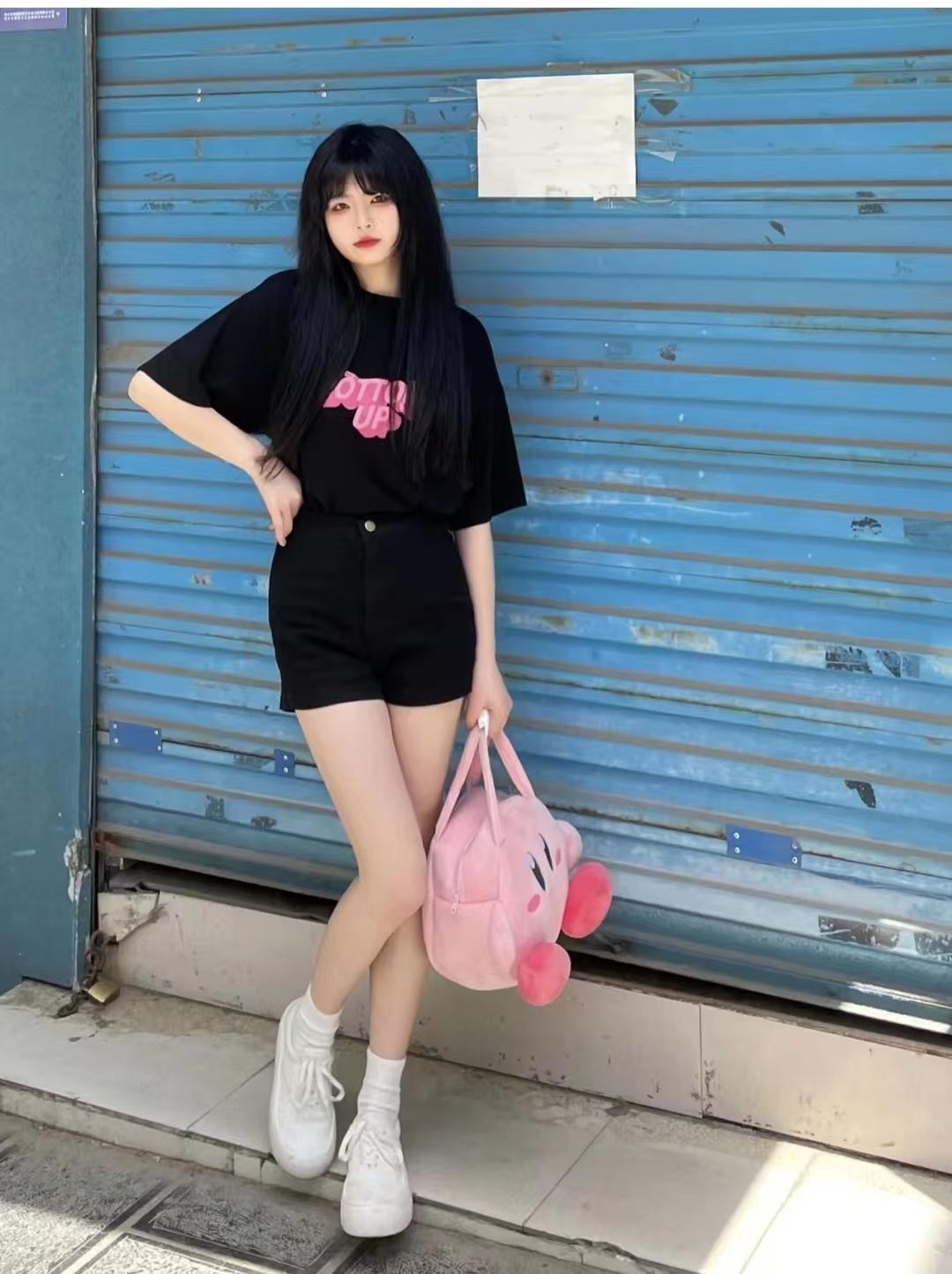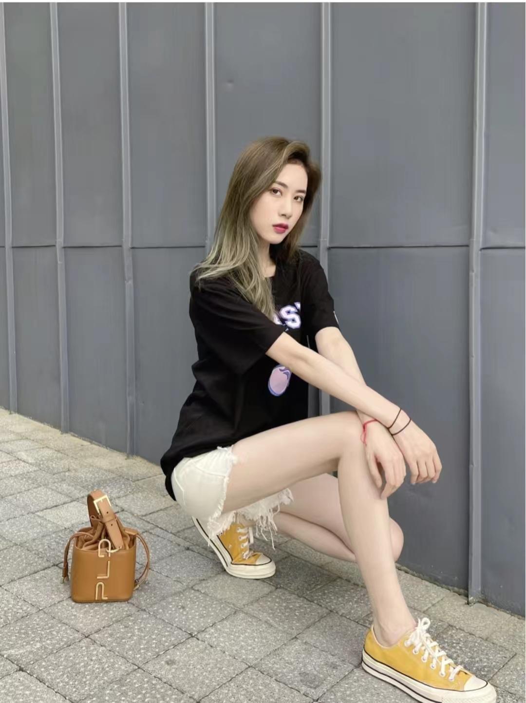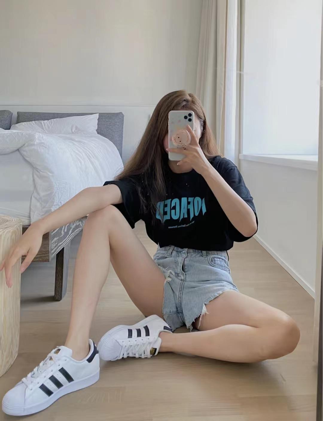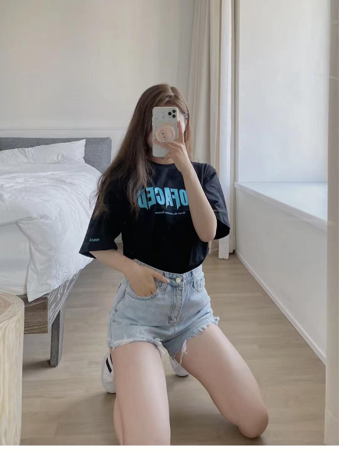 I haven’t tried denim shorts for a long time. Just pair them with a T-shirt and white shoes. The girl group has a familiar look. Wearing it like this will turn heads a lot, and the pink letters on the black T-shirt are so sweet and cool.
