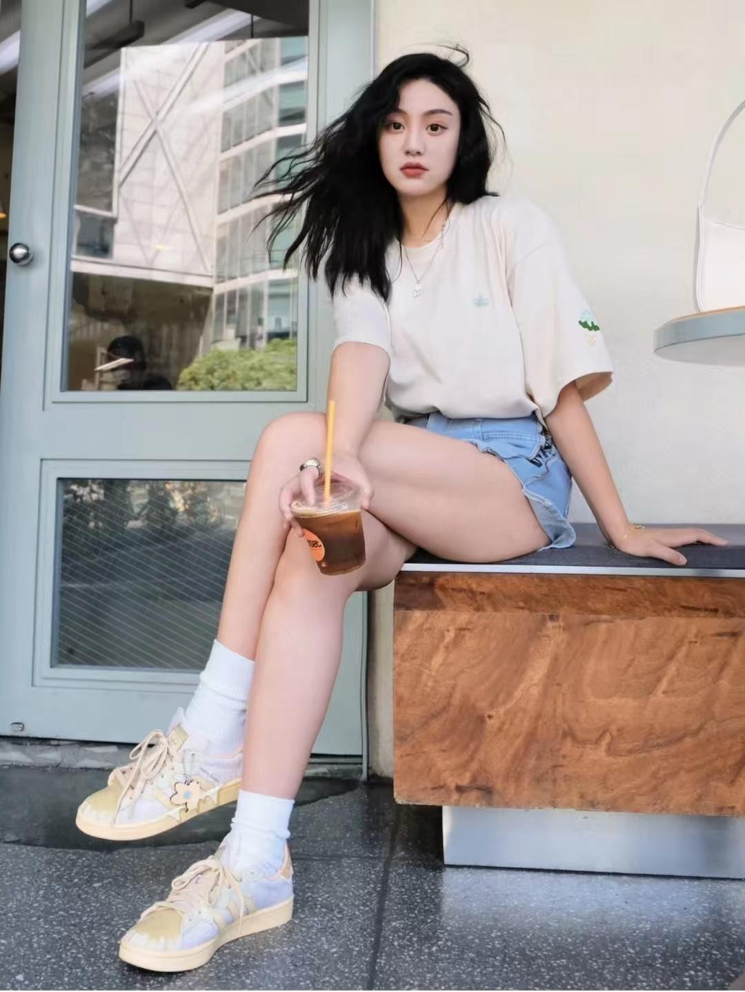 This stylish setThe top is a pink lettered T-shirt, and the lower body is paired with light blue raw-edged denim shorts and apricot orange sneakers. The shoes echo the letters of the T-shirt, and the set has a very American casual feel.