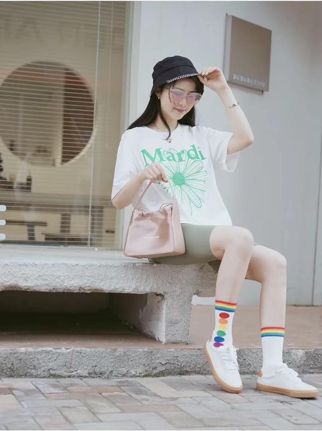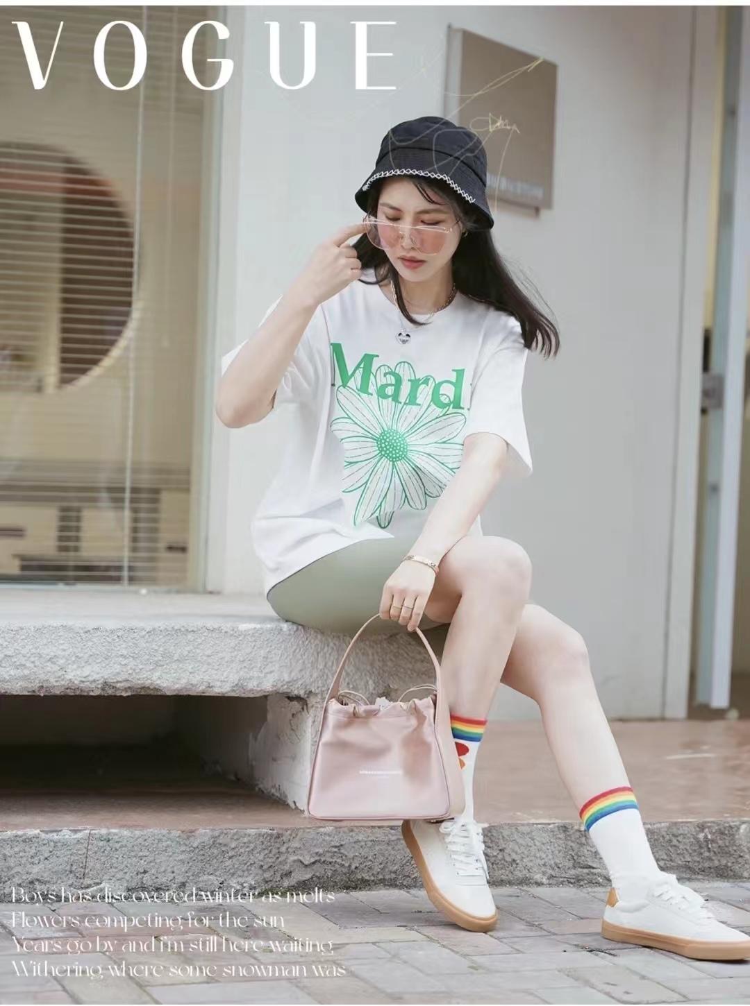 T-shirt + shorts are a versatile combination. You can tuck the T-shirt with the Kuka pattern into your jeans. The whole proportion will be much longer, and the summer look will be more layered. The T-shirts, shoes and bags are all matched with the same color, which makes the whole look look younger. The shoes are very much like honey wafer-flavored ice cream, and there is a Babo little one. The bee pendant also makes the whole summer sweet.