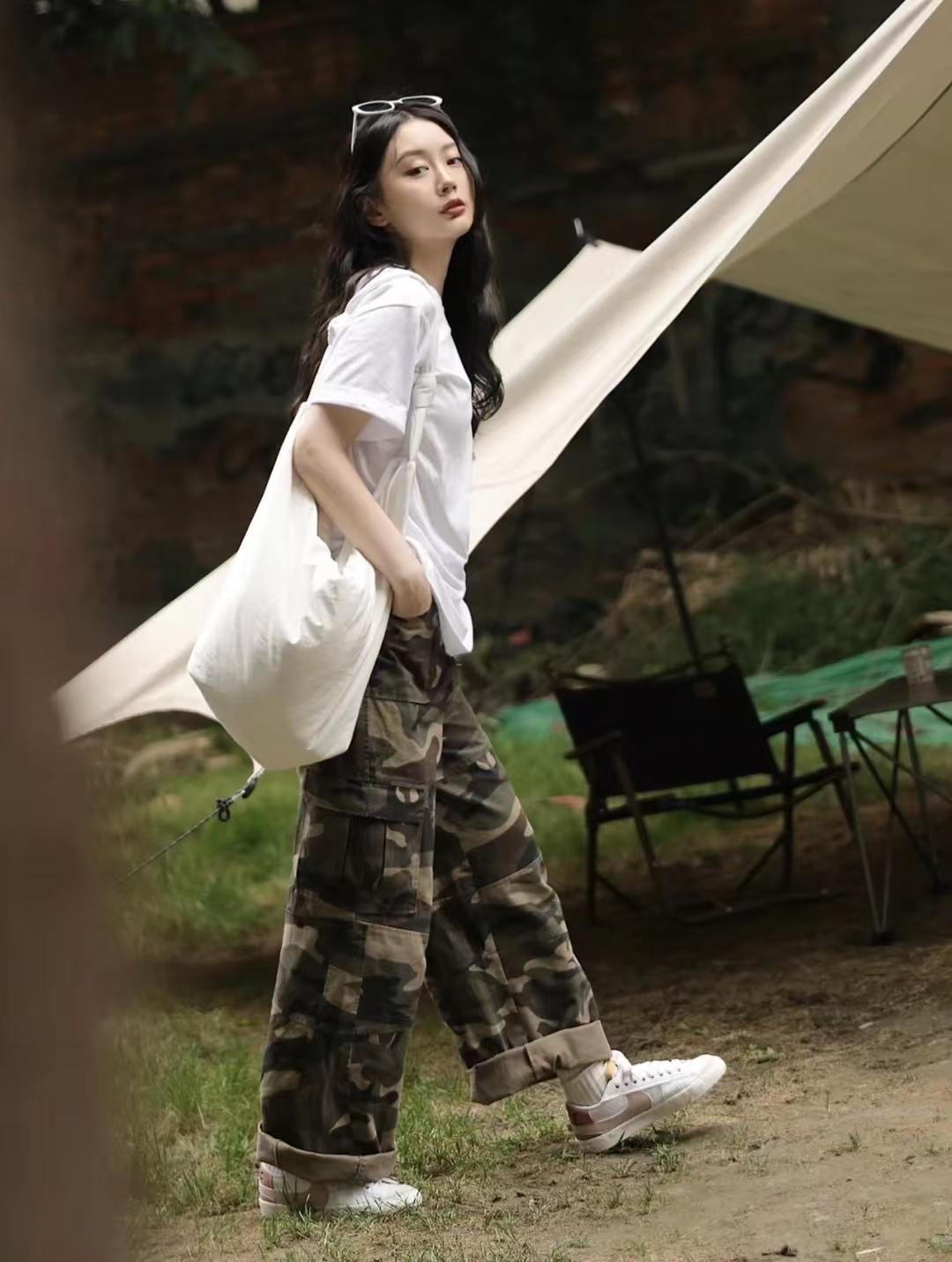 A set of casual and fashionable looks. I love the white embroidered T-shirt recently. It has a simple and exquisite embroidered logo. It can be worn alone. Or it looks good when worn underneath. The lower body is matched with the recently popular camouflage pants. It has a casual and comfortable city girl feel, and it is very photogenic!