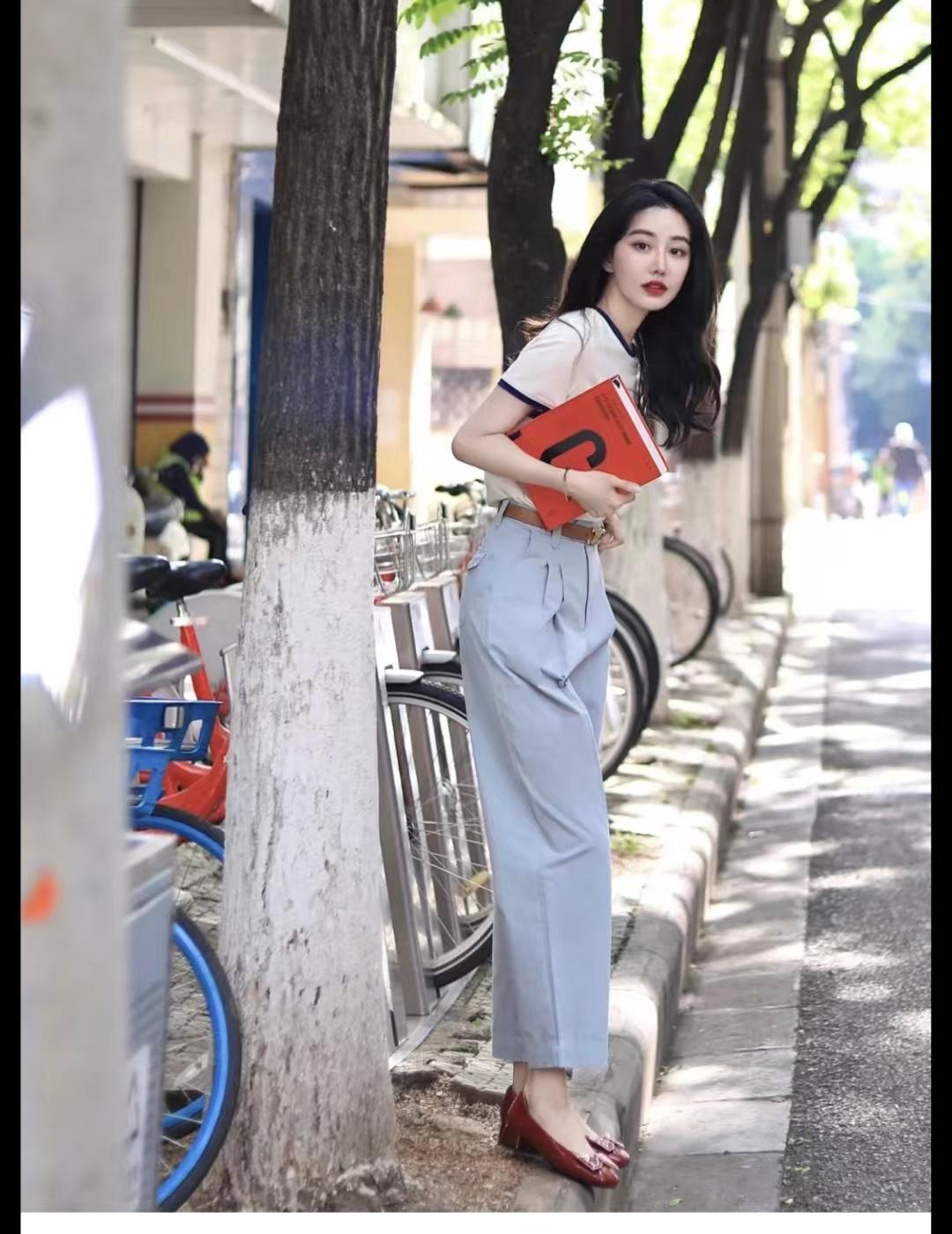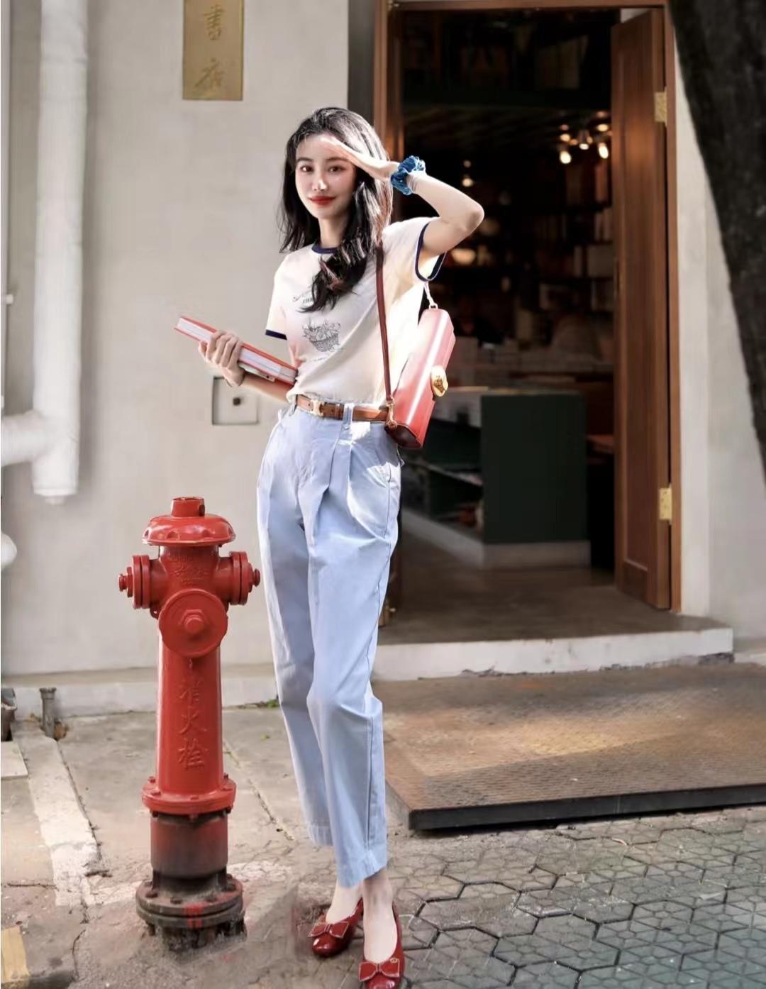 Summer loves simple, bright and comfortable outfits, shoulder-length The French T-shirt is very slimming, and the sky blue radish pants are friendly to a pear-shaped figure. Paired with red Mary Jane shoes, the lightweight square heels elongate the leg lines and provide perfect comfort.