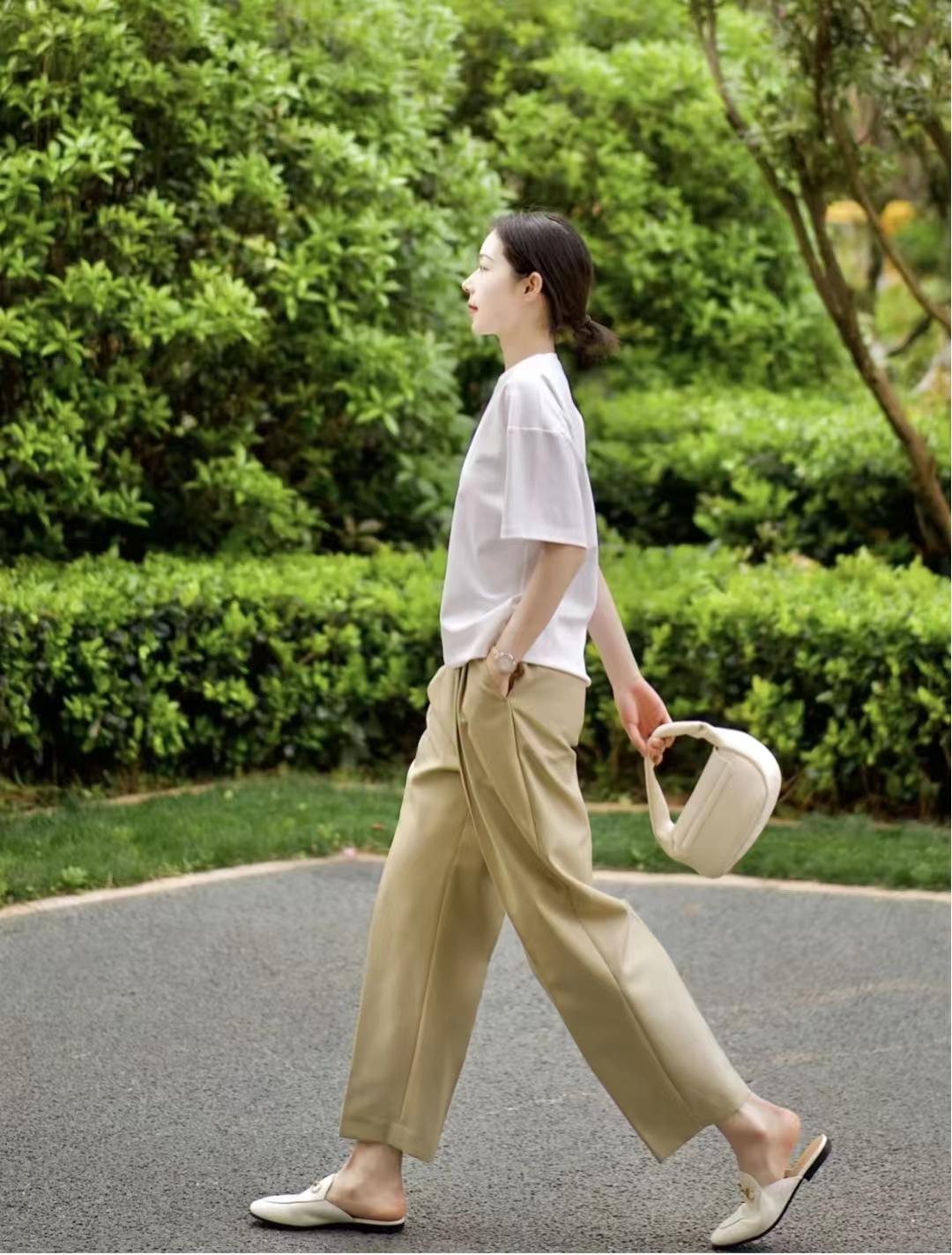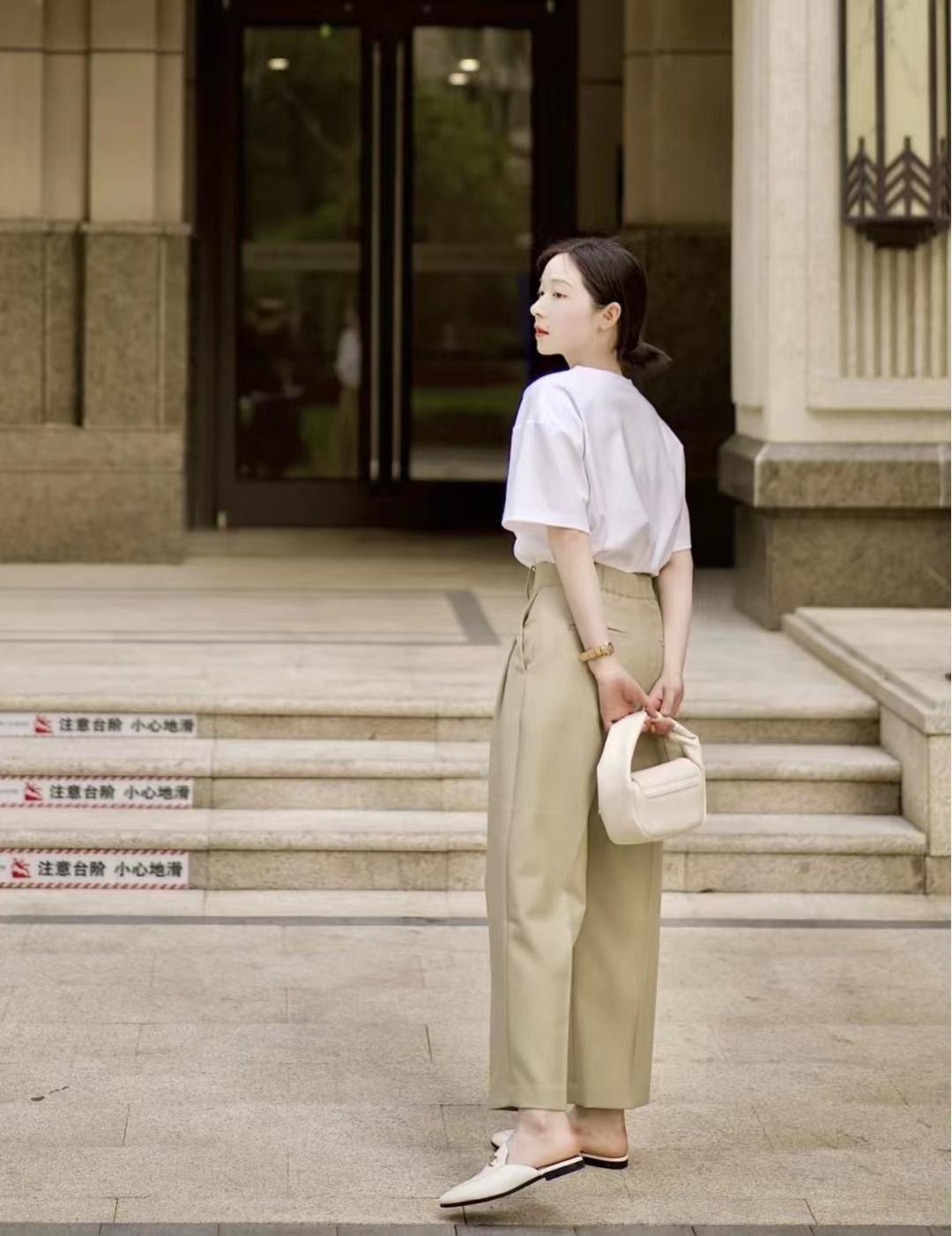 A white T-shirt and suit pants should be essential items in your wardrobe. You can easily go out in the morning and are suitable for commuting to work. You can also go shopping with friends for dinner and shopping after work. It is also suitable for wearing a straw bag for vacation.