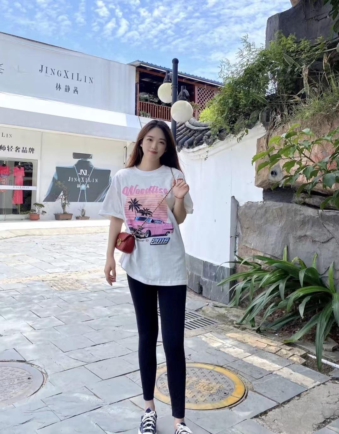 I don’t know what to wear when going out in summer It’s the right time to choose a T-shirt, it’s easy to wear and easy to match. The standard summer outfit is to be clean and refreshing. The cartoon print on the chest is pink and tender, which is girly and full of vitality. Paired with the black shark pants, it is very comfortable and very elastic. The matching rule of wide top + narrow bottom is slimming plus.