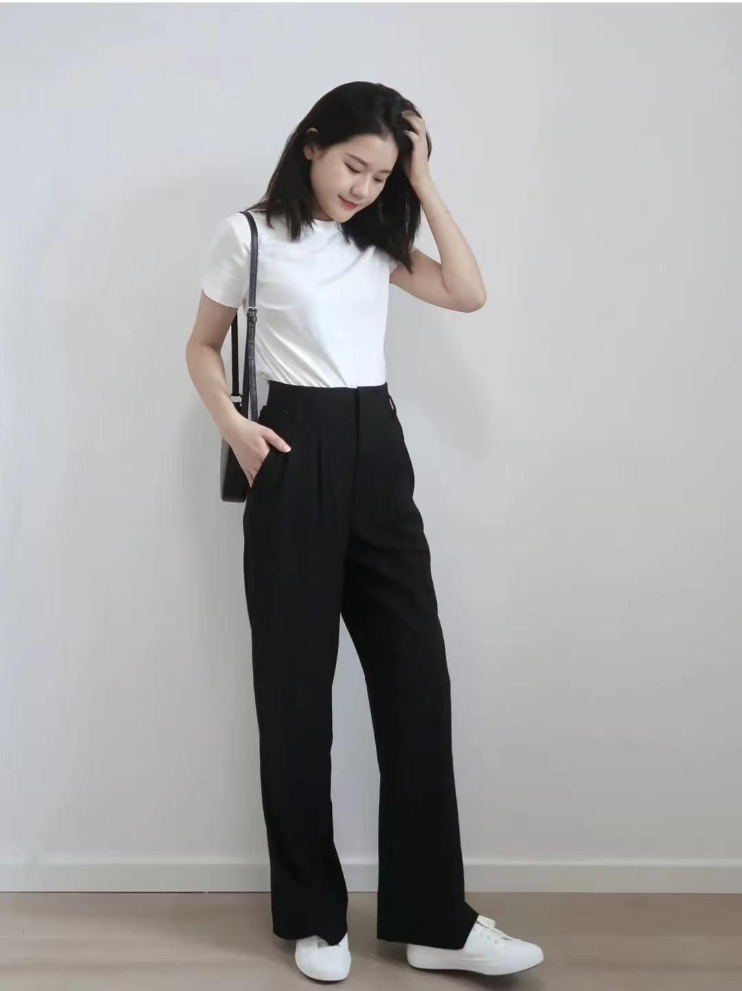 look5 white T-shirt + black high-waisted suit pants + white shoes