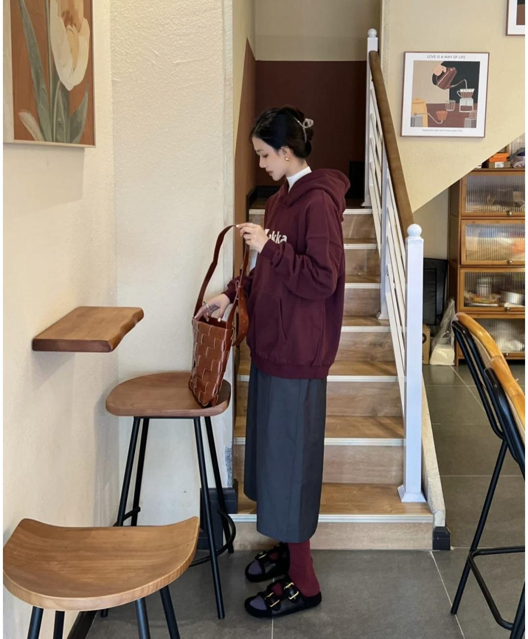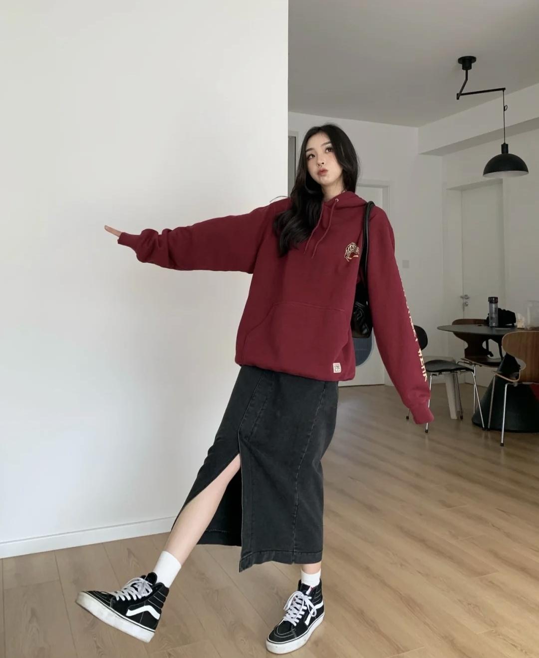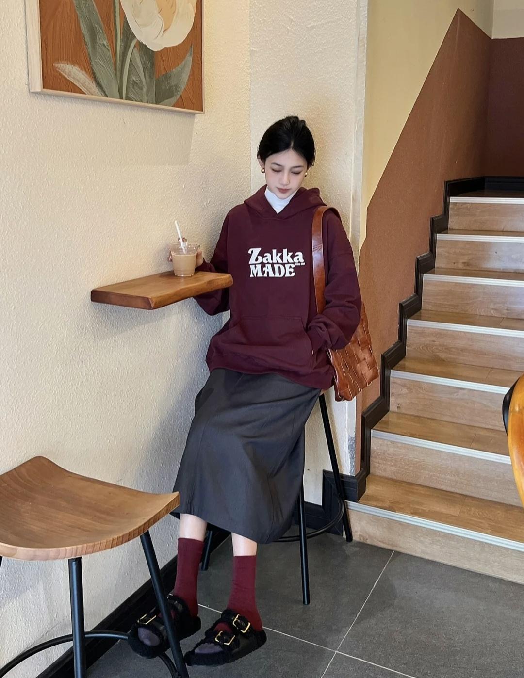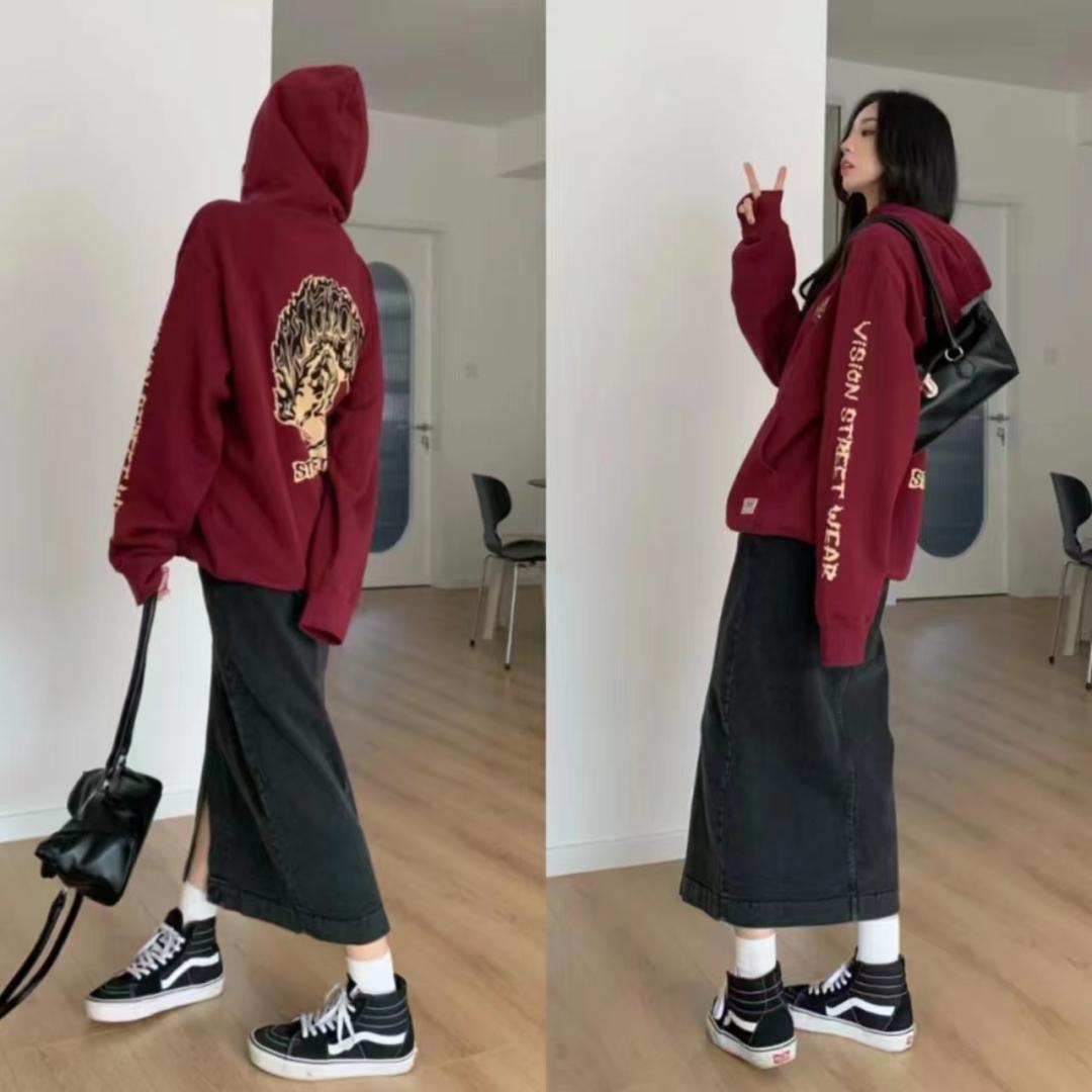 Sweatshirt owners are welcoming a new color to their wardrobes. Burgundy is really white, and the golden pattern on the back is super cool. It matches perfectly with the black slit denim skirt. , so simple and beautiful to wear.