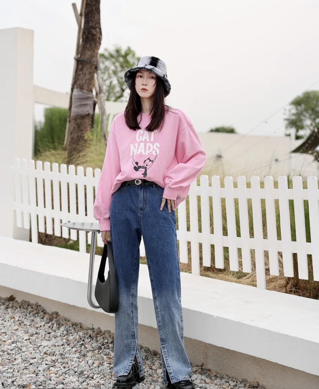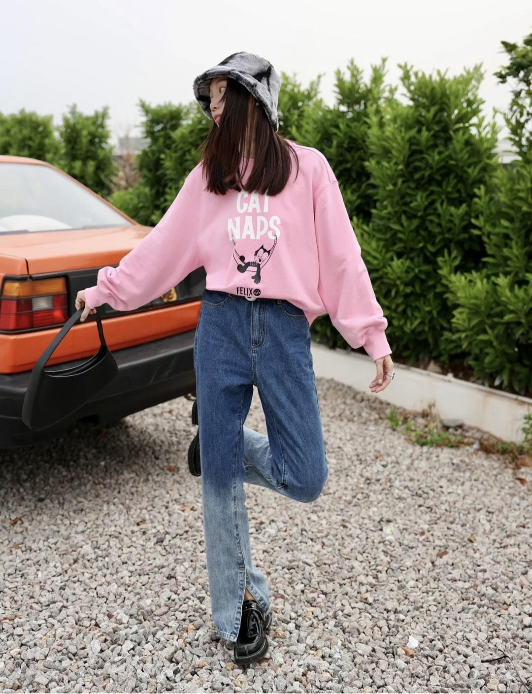 Pink is A color that makes people feel happy. The Philly cat print on the chest of the pink sweatshirt is playful and eye-catching. Paired with blue gradient jeans, it is both age-reducing and fashionable. This pair of pink and blue CPs really looks tender and white. Pair it with black square-toe shoes and armpits. The lower package neutralizes the sweetness.