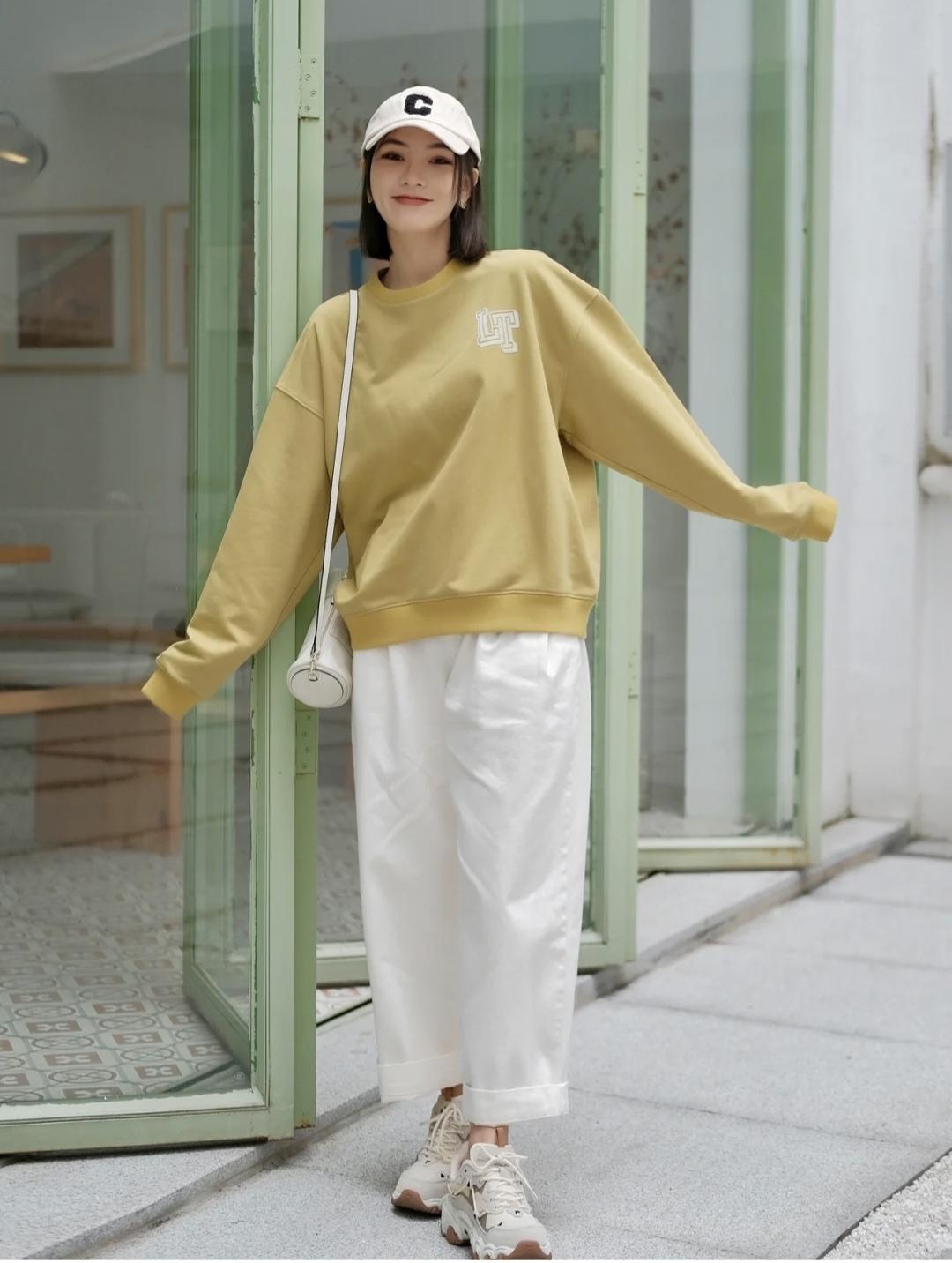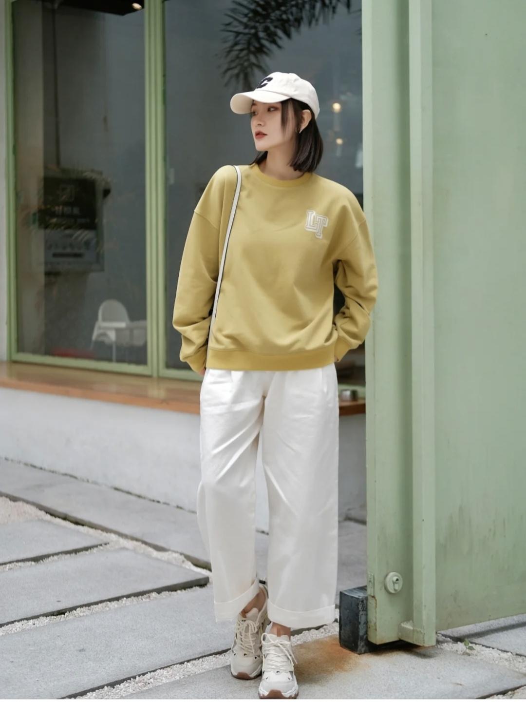 The fresh yellow-green color is like wearing spring on your body. The loose basic version can be worn outside or inside. I like this minimalist design and pair it with off-white wide-leg jeans and off-white of the same color. The shoes and hats match, creating a comfortable yet fashionable street look.