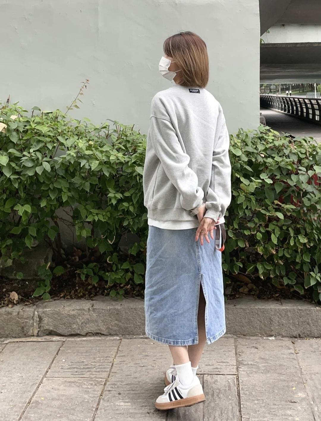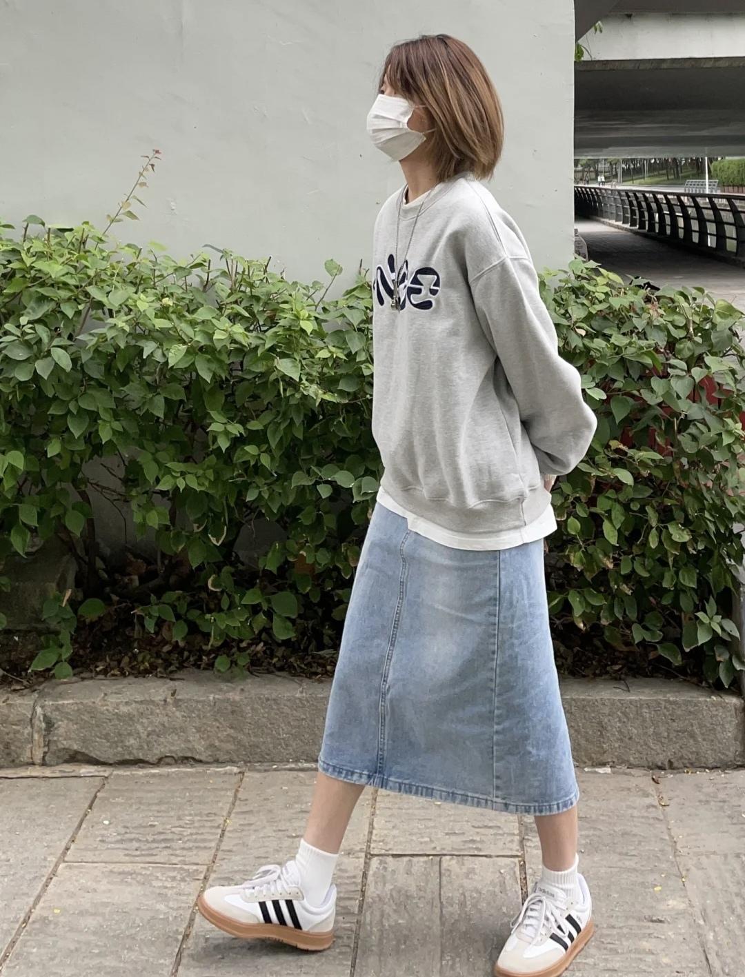 look8 light gray sweatshirt + white T-shirt/light color denim skirt