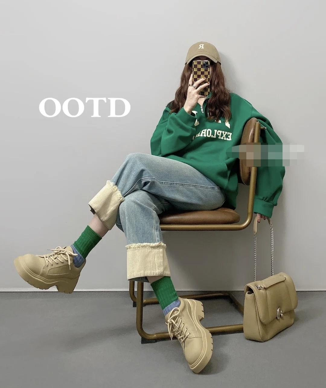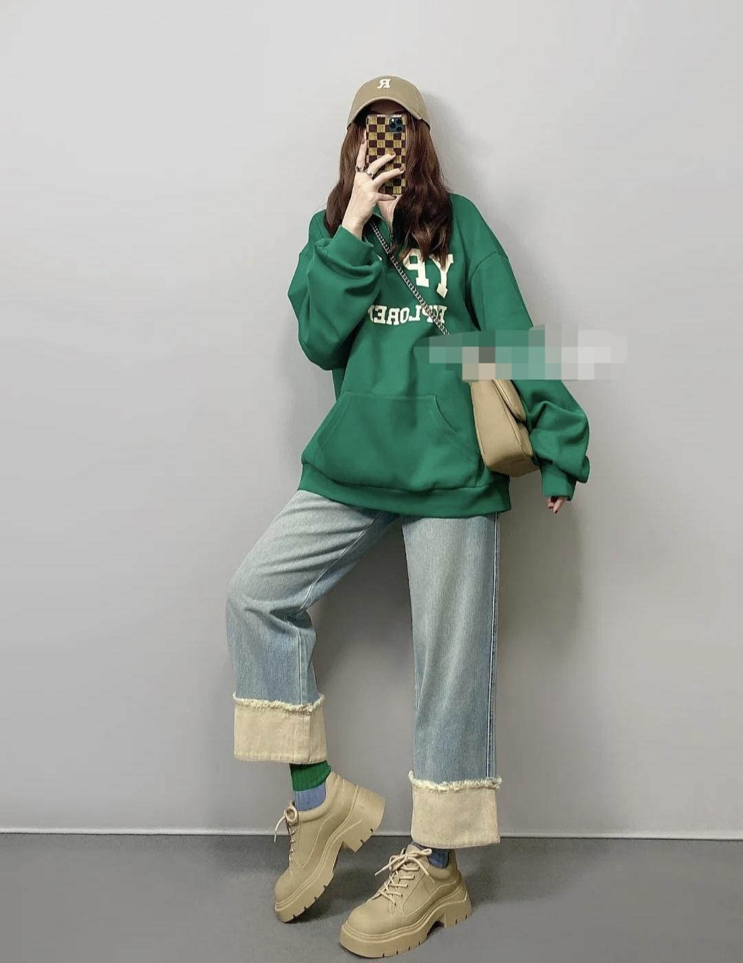 Isn’t this look the color of spring? , the oversized green sweatshirt paired with loose hemmed jeans is lazy and casual. The collision with the khaki items is fresh and advanced, and it is another day of looking forward to spring.