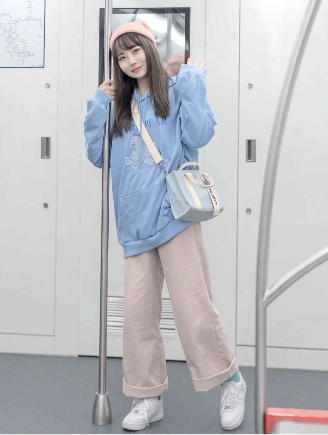 Sky blue+ The leather pink color is too girly, the color scheme is so gentle, it’s a simple and cute outfit for little people. Pink pants look great with a sweater. The light blue sweatshirt is super white and looks so cute paired with a blue bag.
