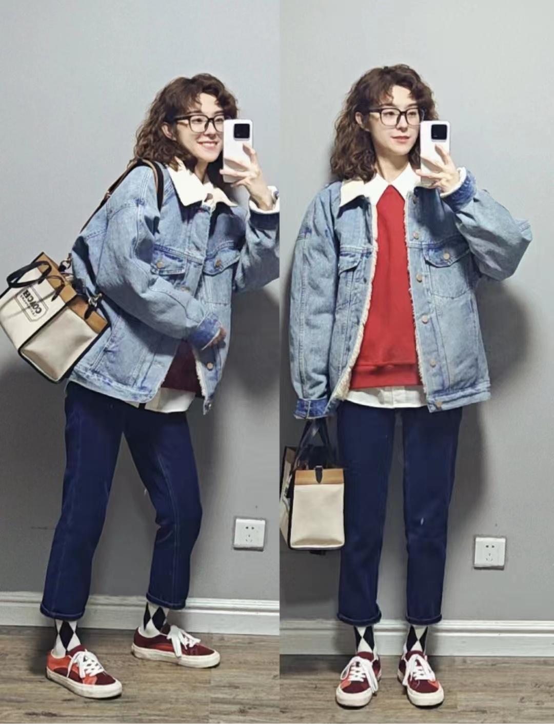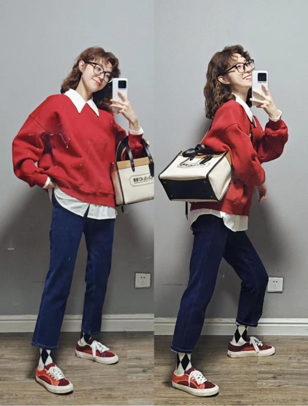 Spring It’s sweatshirt season! Compared with hooded sweatshirts, I prefer pullovers because the neck looks longer. The color of this one is great and white. The starry sky cotton fabric is quite wide and comfortable. The sweatshirts look really good when paired with shirts. The red and green colors are beautiful!